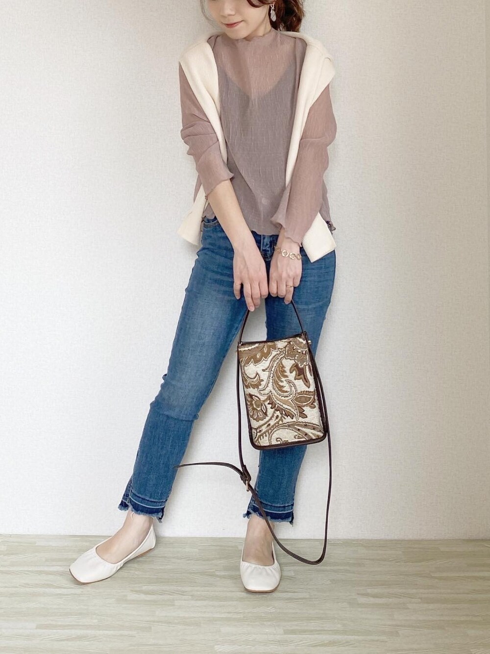 ご覧いただきありがとうございます◟̆◞̆* トレンドのシアートップスはやっぱりデニムとかと カジュアルに合わせるのが可愛いですね( *´艸`) カーデを肩掛けすると露出が少し抑えられて良き◎ ボタンが可愛いカーデは見えるように肩掛けしてます♪