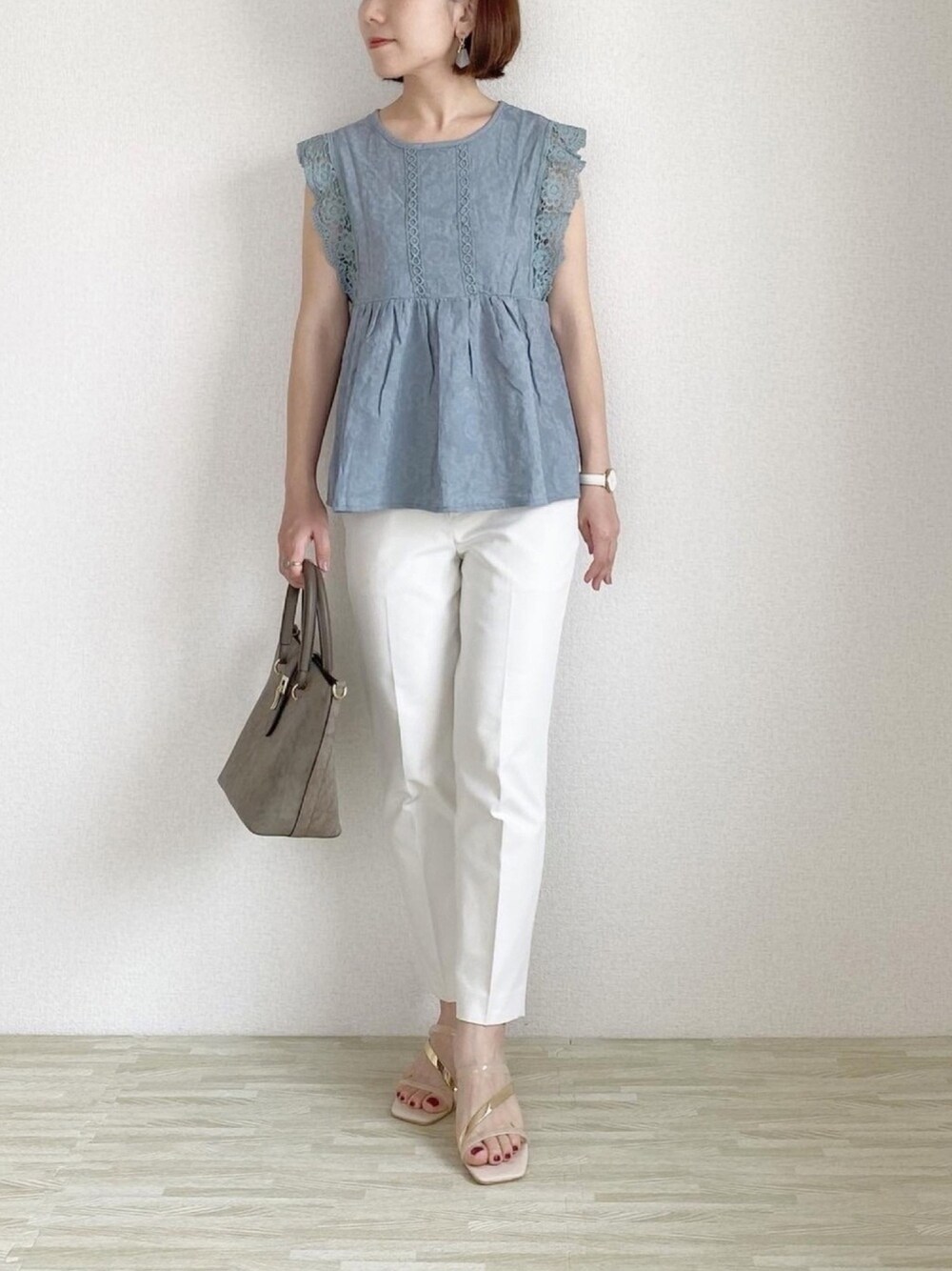 Nanaのシャツ/ブラウス「レース袖ペプラムコットンブラウス」を使ったコーディネート