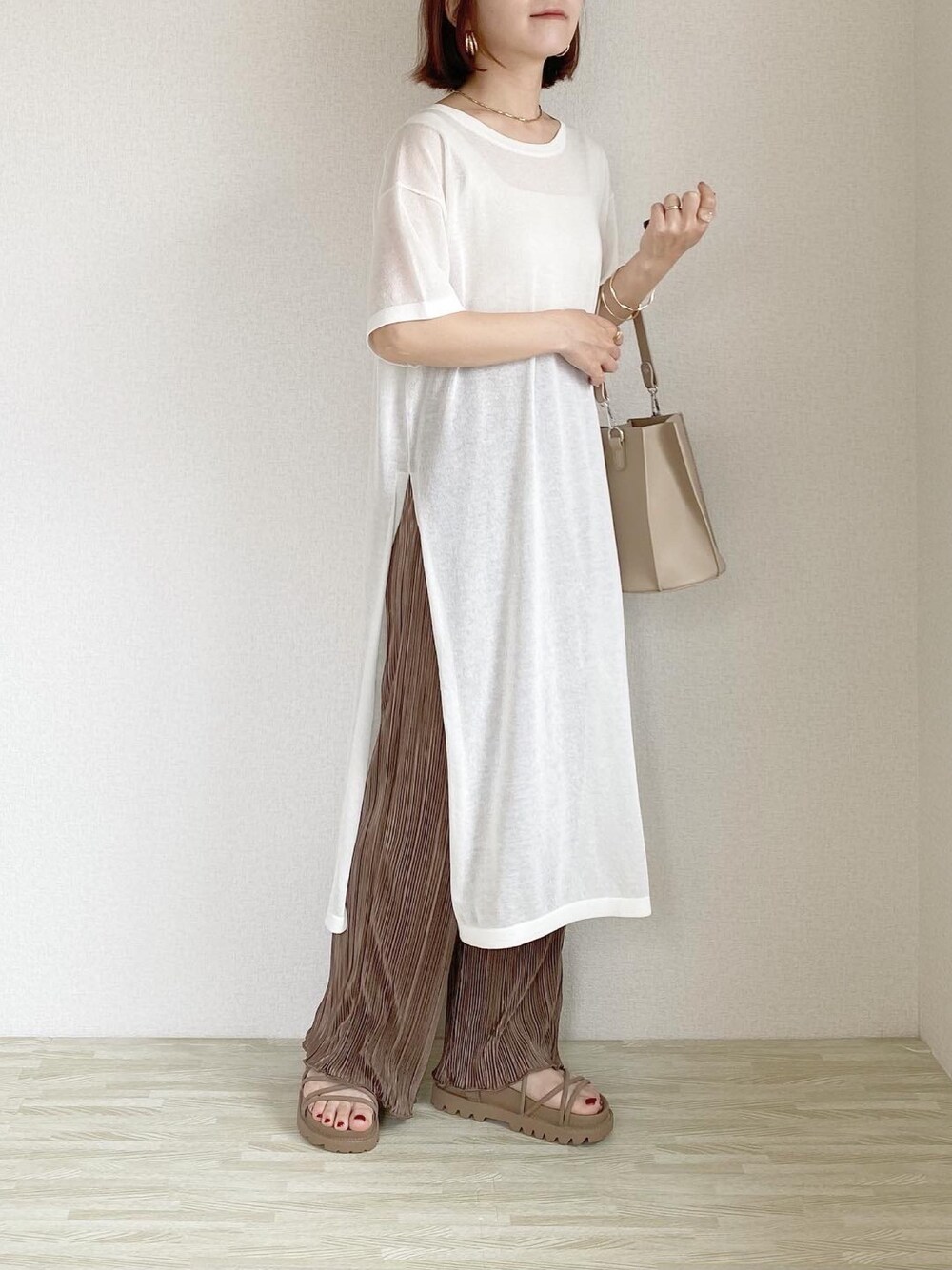 ご覧いただきありがとうございます◟̆◞̆* GUで購入したものが届いたので そちらを使ってコーデ組みました◡̈⋆* シアーニットワンピース オフホワイト/XS ランダムプリーツドローストリングパンツ ブラウン/XS ブラフィールスクエアタンクトップ ナチュラル/XS 何気にブラウンのパンツって初めて買った気がします˚✧₊ こちらのボトムス持っていらっしゃる方も多いですよね♪ 結構前から出てましたが私はなんとなくスルーしてて… でももっと早く買えばよかったヾ(。>﹏<。)ノ゙ ぺたんこ靴でもすらない丈で ウエストサイズもぴったり!! 洗濯機で洗えてお手入れもしやすいなんて 色違いで揃えたくなります( ˃̶̤̀◡˂̶̤́ ) 本日27日まで限定価格なので気になる方はお早めに! シアーニットは新作アイテム❁ 薄くて軽くてこれから暑くなる季節に良さそう˚✧₊ 深めのサイドスリットなのでパンツにもスカートにも◎ いろんなレイヤードコーデが楽しめそうです( *´艸`) 白は特にシアー感強めなので インナーは透けても大丈夫なものを選んで下さいね! 私は悩みに悩んで白にしたけど、きっとベージュも可愛いはず♡ インナーはこれこそ透けてもイケるやつ!! スクエアネックのカップ付きインナーで 背中もスクエア型に深めに開いています。 トレンドばっちり押さえてますね⭐︎ しかもナチュラルでもカップの部分透けません˚✧₊ アンダーのゴムもしっかりしてるし あまり下着感のない生地なのでヘビロテ間違いなし★ こちらも本日まで限定価格です(*´◡`*)