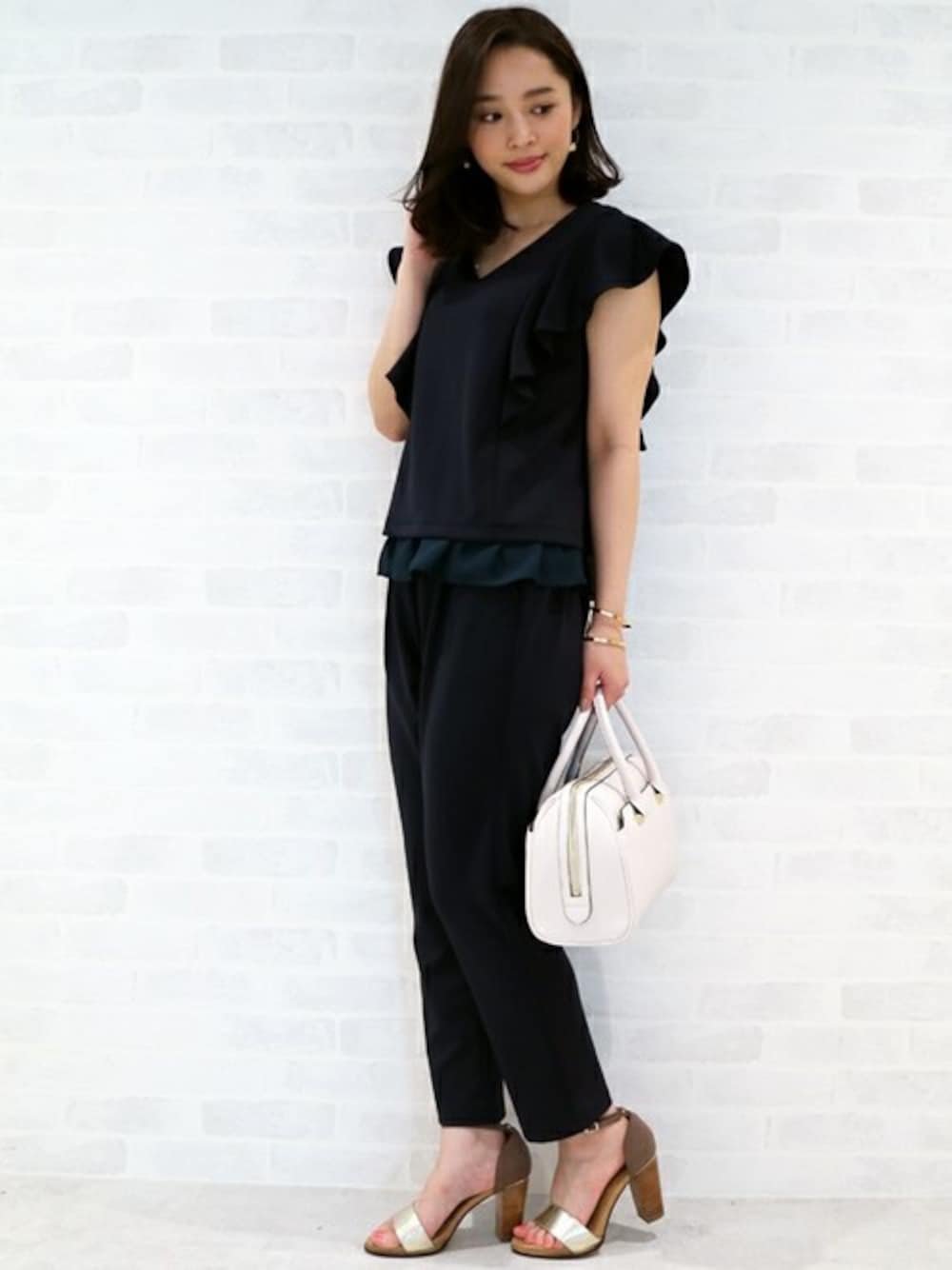 N. STAFF(N. Natural Beauty Basic* OFFICE)のつなぎ/オールインワン「ポーチ付フリルスリーブポンチセットアップ*しわになりにくい*結婚式ワンピース」を使ったコーディネート