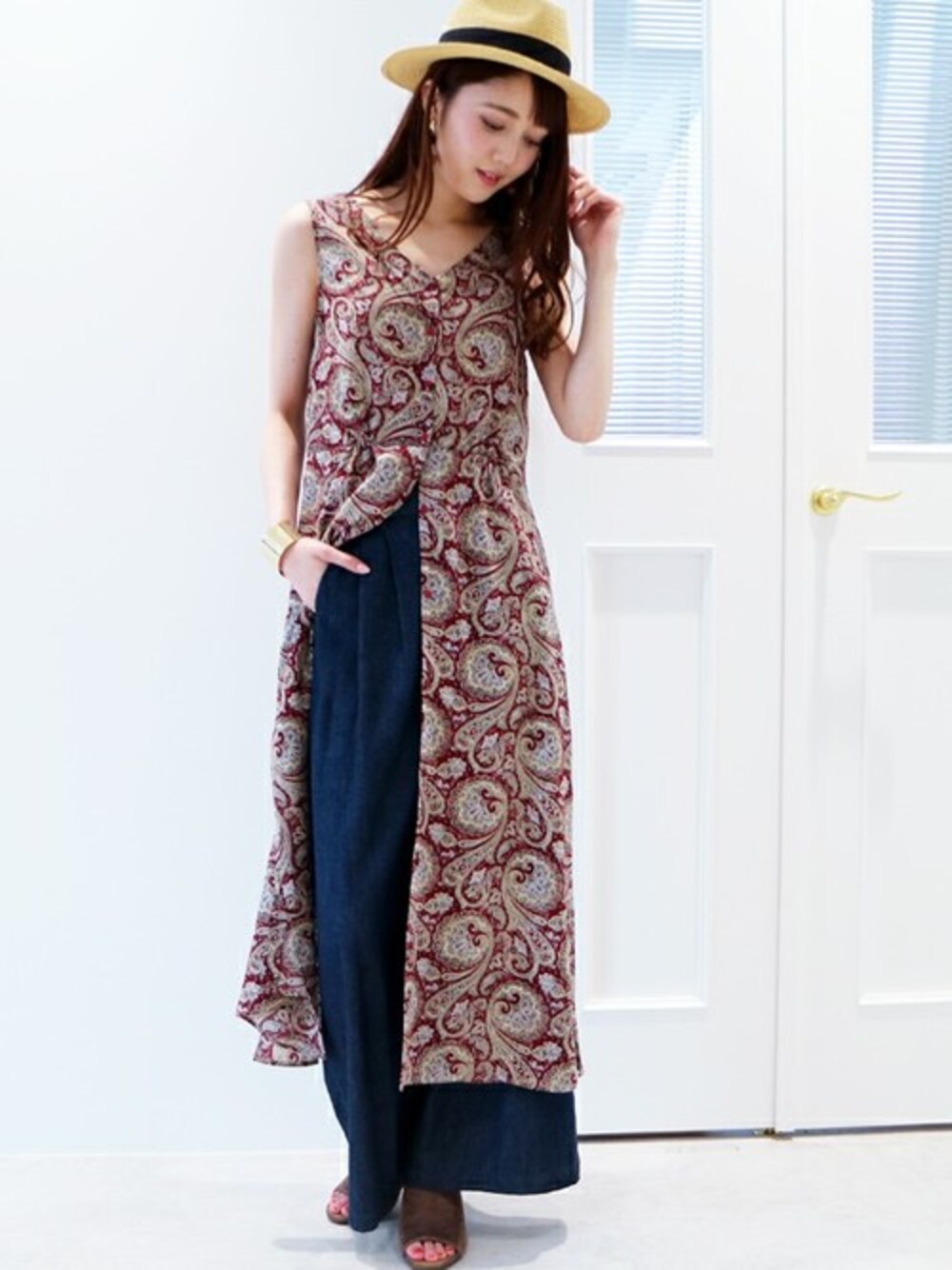 ワンピースやロングジレとして2通り着こなせるアイテム! レトロなペイズリー柄は、深みのある大人見えな配色でおしゃれ度UP★ 存在感のあるレッドは、1枚でワンランク上のトレンドstyleに♪