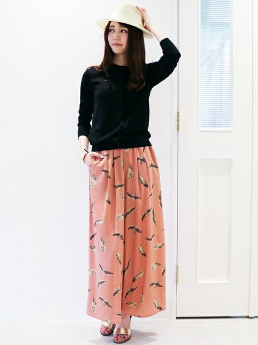 ボヘミアンムードたっぷりなフェザープリントワイドパンツ! 大人っぽい単色フェザーがコーディネートのアクセントに。 トップスや小物はシンプルにまとめて、パンツを引き立たせて♪