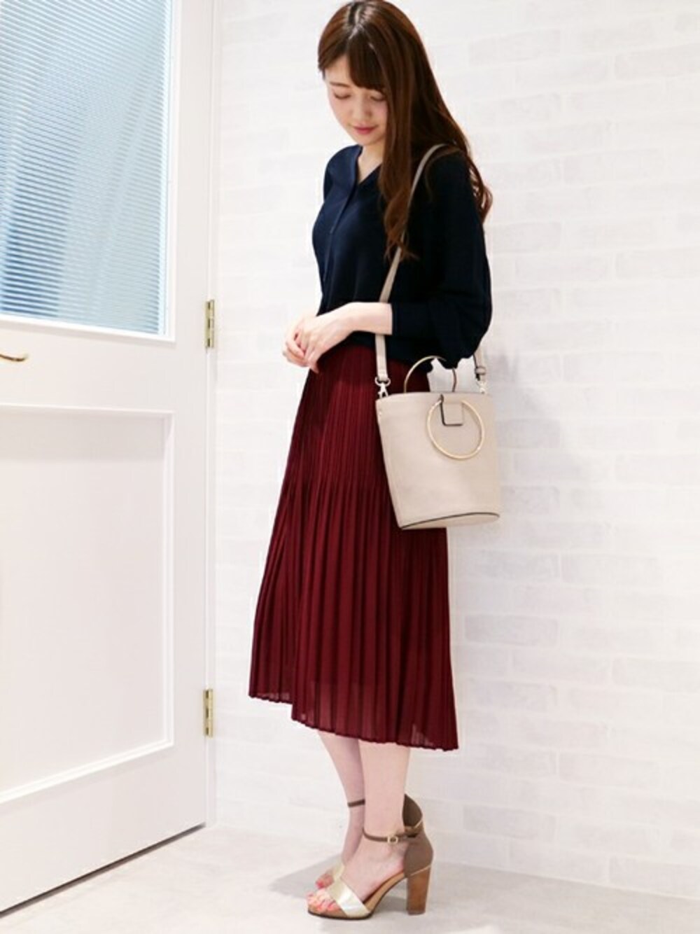 トレンドを楽しむカラープリーツスカート! シフォン生地で仕立て、遊びのあるイレギュラーヘムで足元軽やかに仕上げた1枚。 落ち着いたボルドー×ネイビーは、今から秋まで使えるきれいめstyle♪