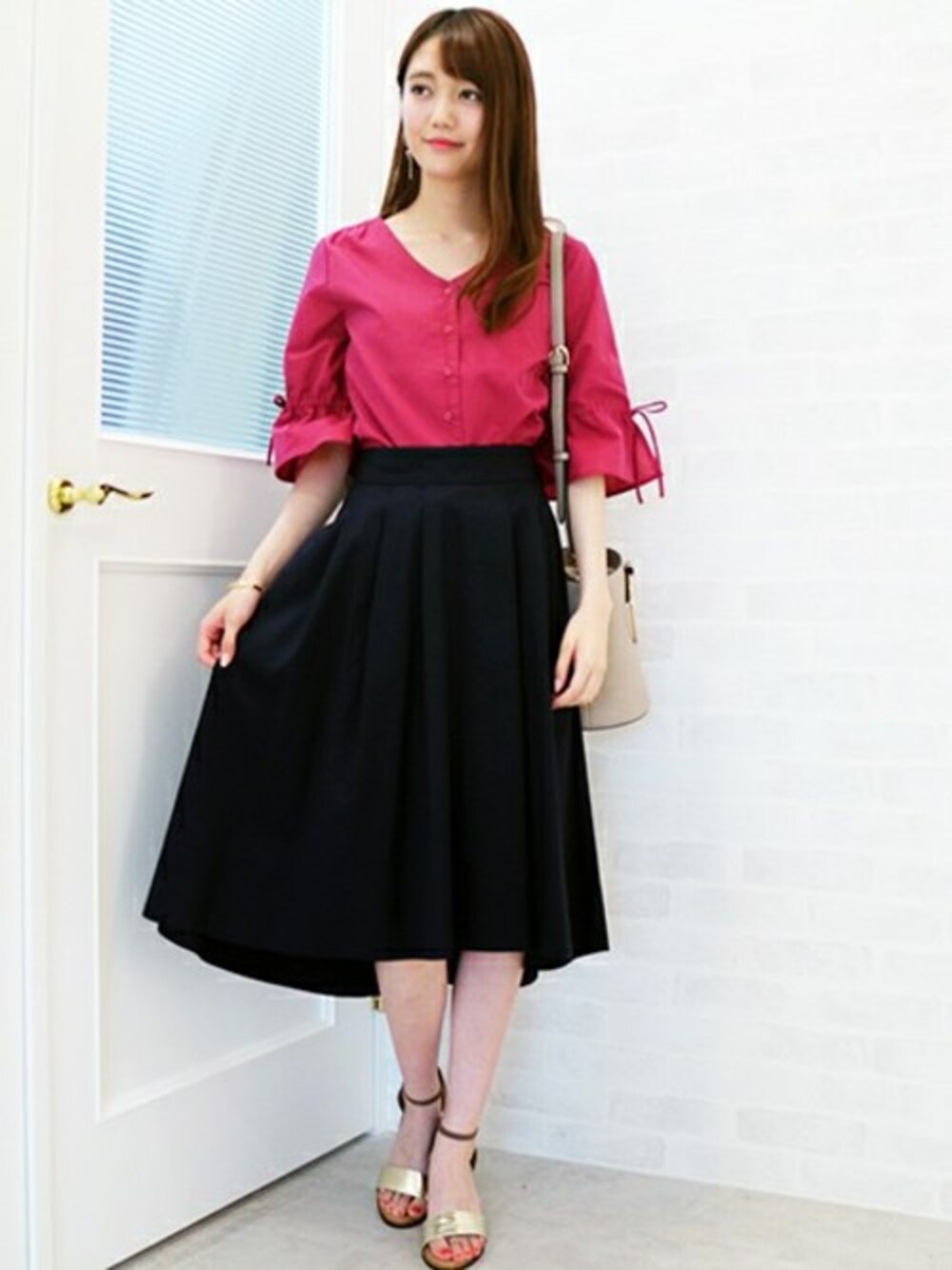 袖コンシャスが今の気分にぴったりなリボンスリーブブラウス! シャープなVネックに、キュッと絞れる袖先リボンがデザインポイント。 少しくすんだピンクは、フレアスカートと合わせて落ち着いた大人の雰囲気に♪
