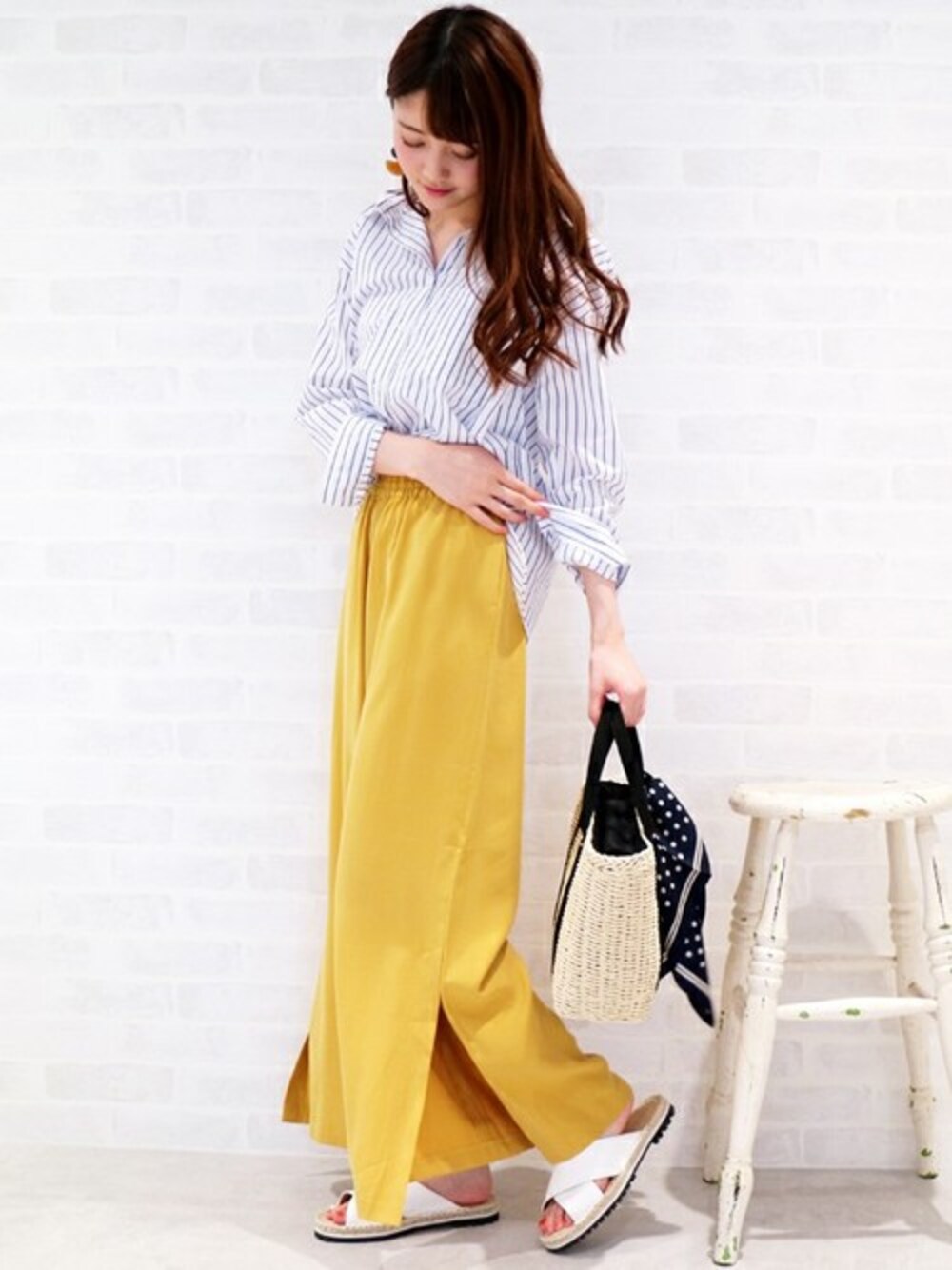 ボリュームのあるワイドフォルムも軽快に穿けるカラーパンツ! ワイドシルエットで存在感があり、裾サイドは大胆にスリットが入ったトレンドデザイン。 ブルーストライプ×イエローで、夏にぴったりな爽やかstyleに★