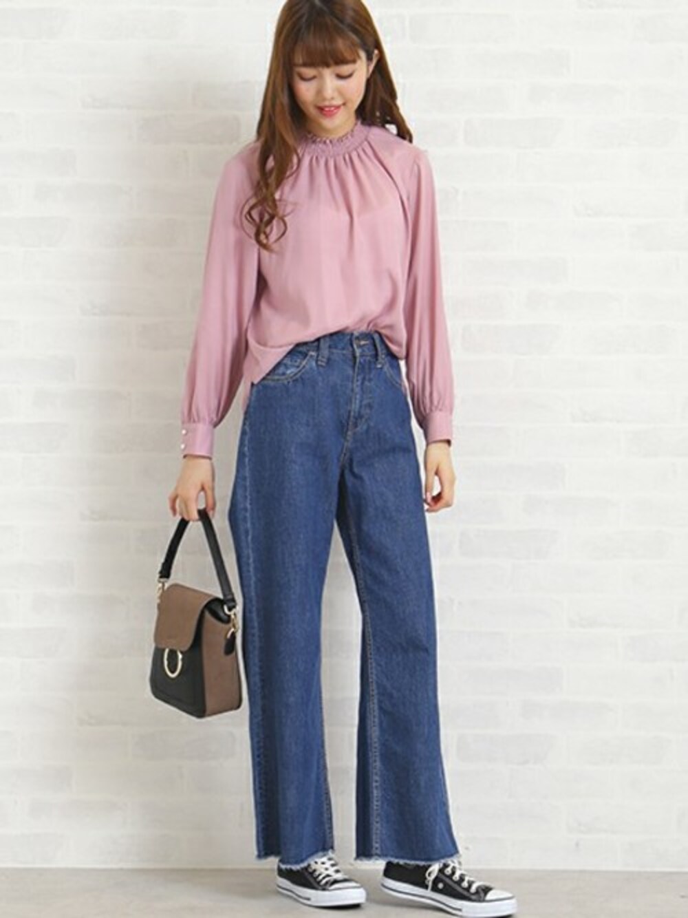 マットサテンを使用した上品なイメージを作るハイネックブラウス! 後ろと袖口のパール釦が、女性らしさをより一層感じさせるデザイン。 スカートはもちろん、デニム合わせで大人可愛いカジュアルstyleもおすすめ♪