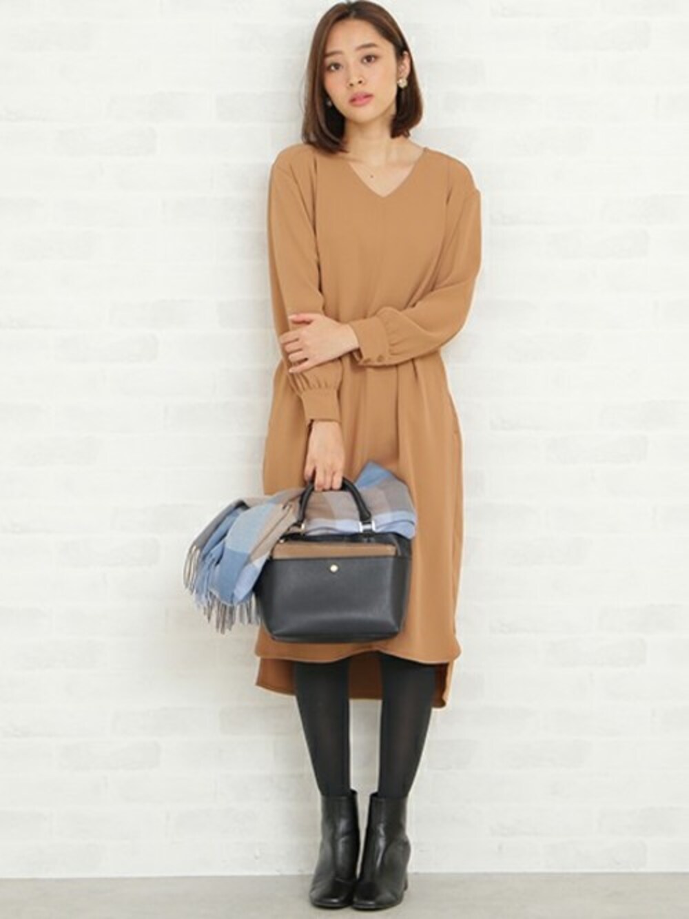 とろみ感のある上品なダブルクロス素材を使用したタックワンピース! すっきりしたVネックラインがデコルテを美しく見せてくれる1枚。 ニュアンスカラーのストールで、上品さを引き立たせて♪