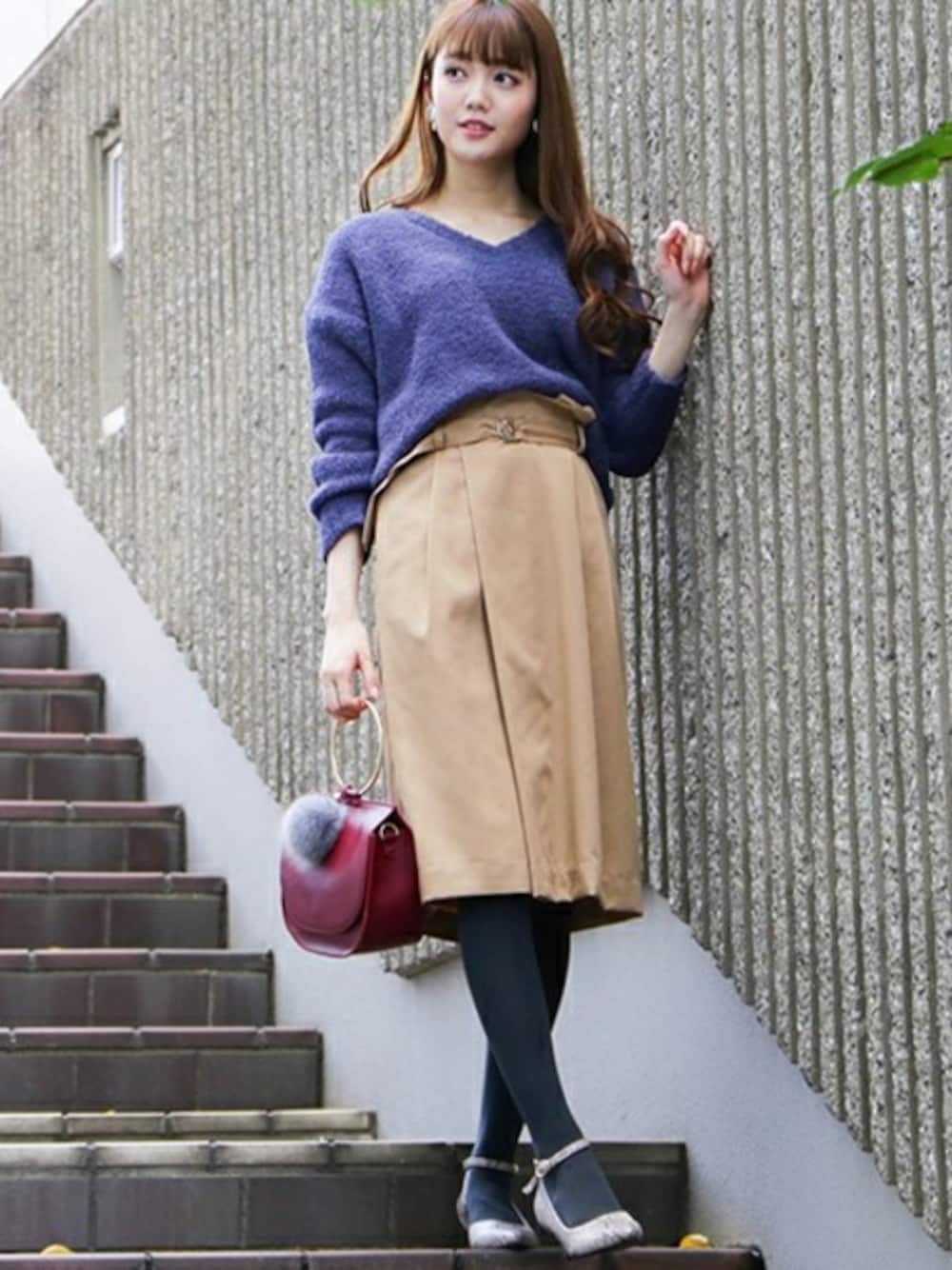 ベロアタッチな触り心地のよいVネックニット! しっかりした肉感で真冬の時期まで着られるアイテム。 タイトスカート合わせでちょっぴり抜け感のあるキレイめstyleに♪