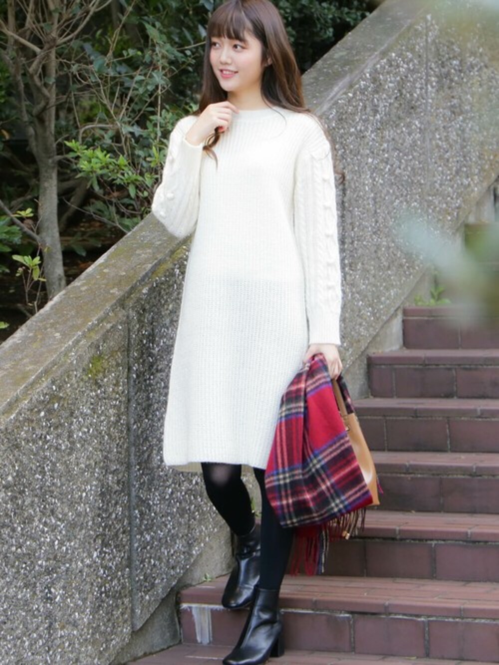 袖がケーブル編みになったカジュアルなニットワンピース! 袖のみケーブル×ポップコーンをMIXさせたディテールが大人可愛いデザイン。 アクセントになるチェックストールで秋冬らしさを引き立たせて♪
