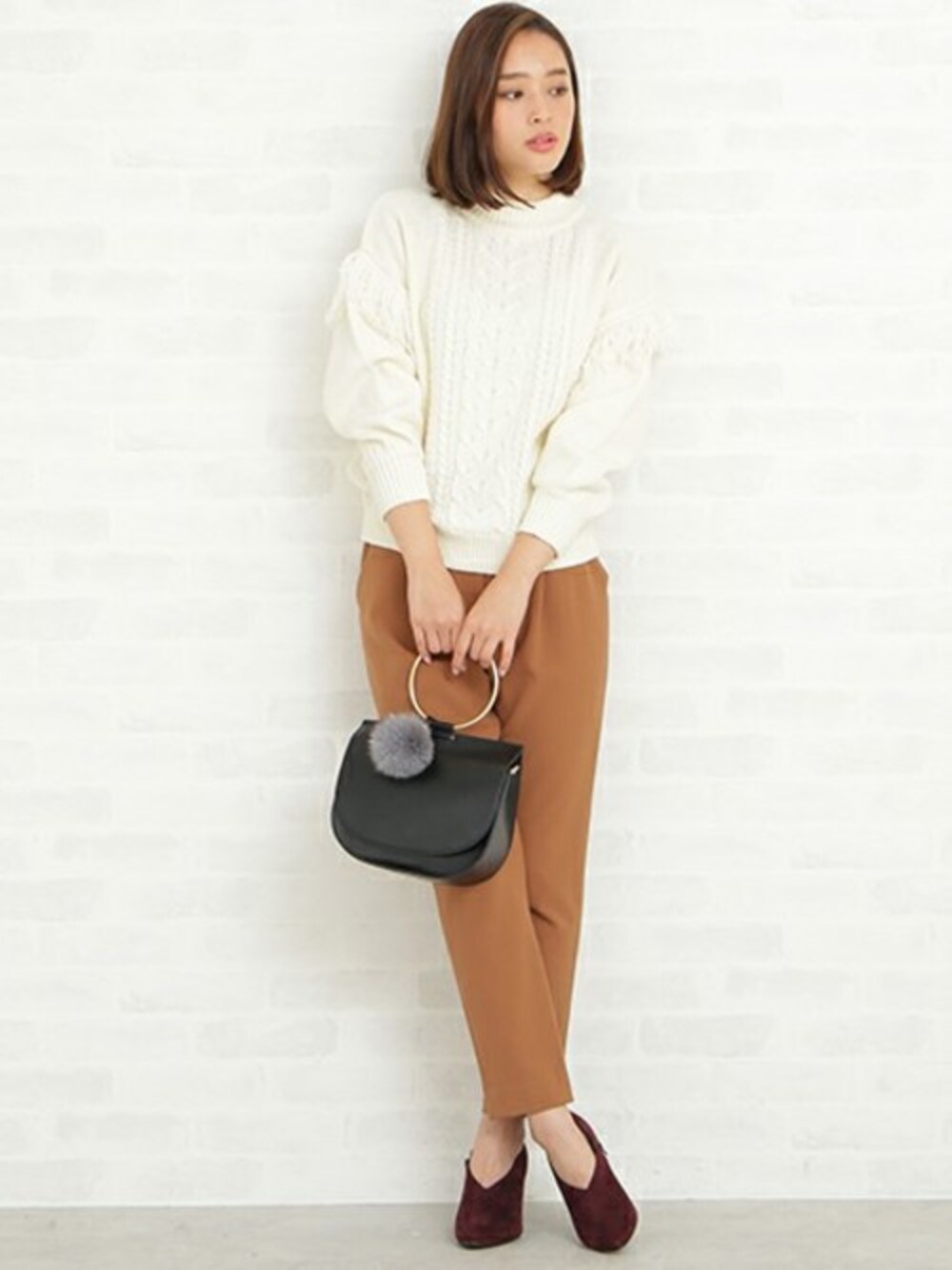 ケーブル柄とフリンジをMIXさせたデザインニット! フリンジを肩落ち部分に施し、女性らしく仕上げたデザイン。 ボトムはシンプルにまとめて、ニットの可愛さを引き立たせて★