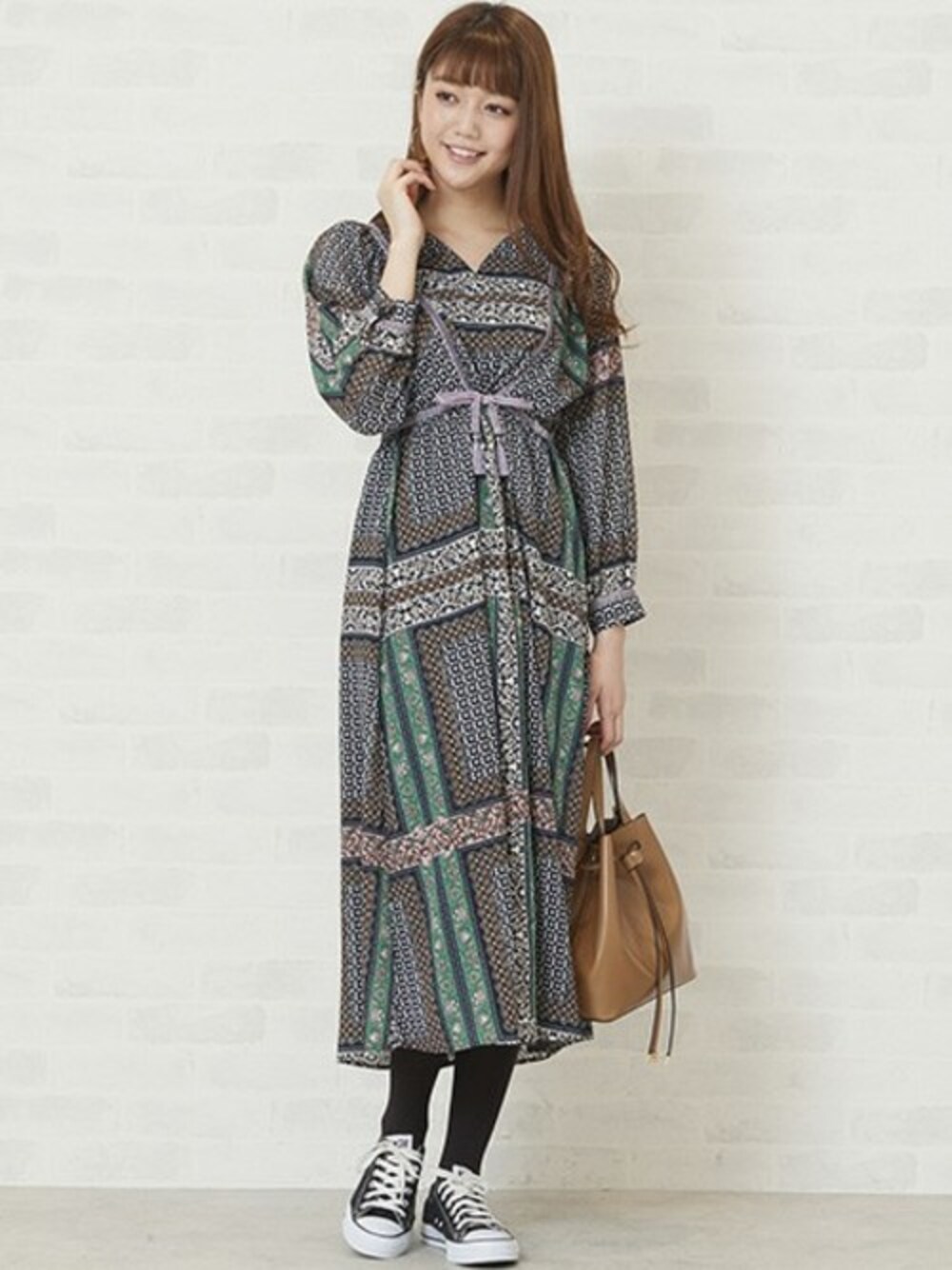 ヴィンテージ感漂うおしゃれな柄が印象的なワンピース! パッチワークしたようなエスニック柄に配色のベロアパイピングを効かせた異素材MIXデザイン。 今から春まで着れる、大人のカジュアルコーデにぴったりな1枚です♪
