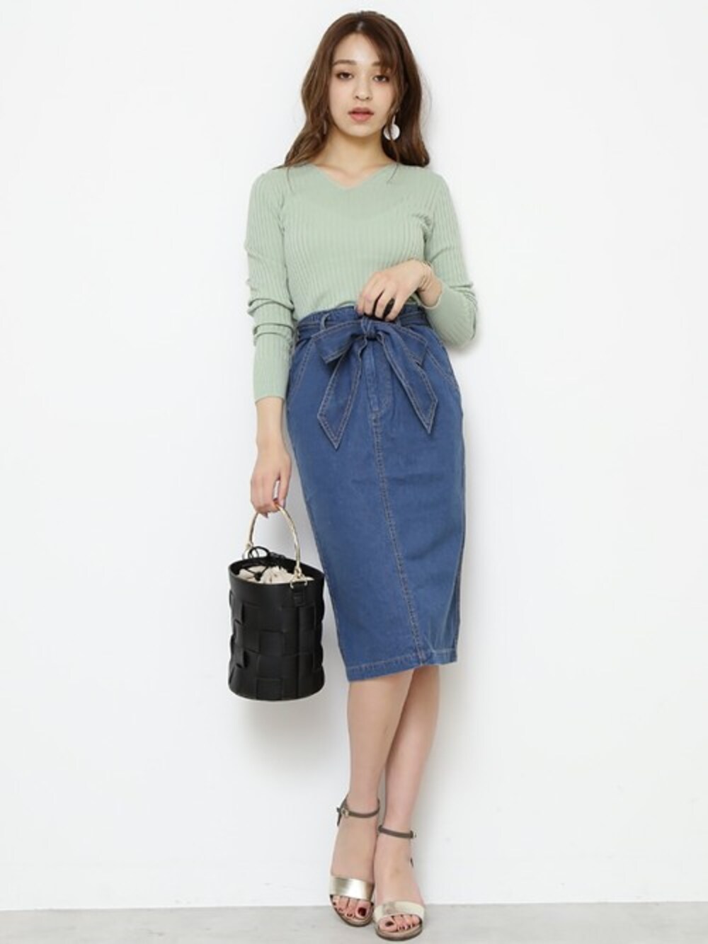 シーズンレスで着られるN.定番のデニムタイトスカート! 同素材のリボンベルト付きで、大人可愛いデザイン。 シンプルなコンパクトニットをインしたstyleがおすすめ♪