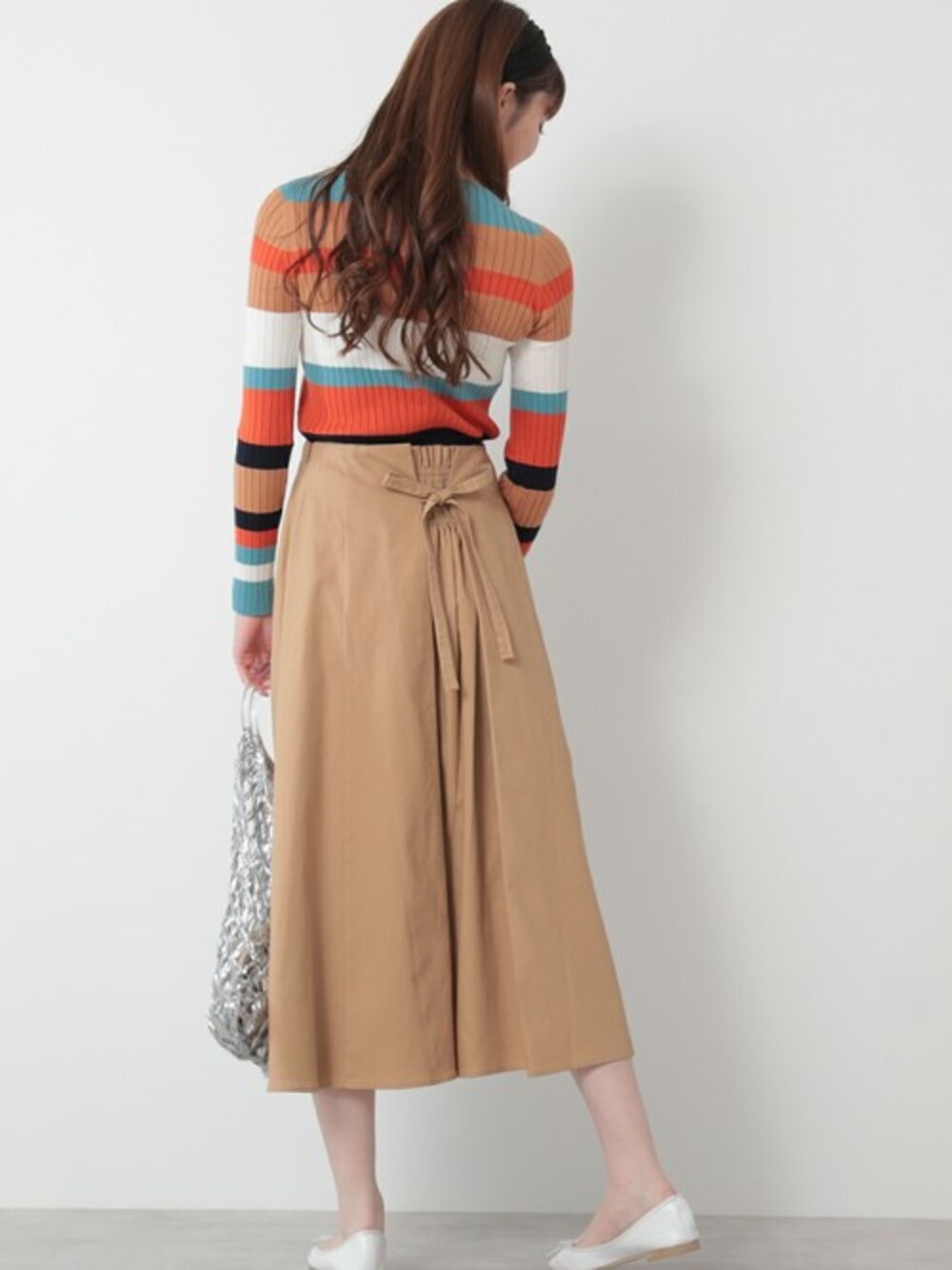 後ろのレースアップがデザインポイントのマキシスカート! 色合いやディティールでカジュアル過ぎずに穿ける1着。 小物は白やシルバーを合わせて春らしさ漂うstyleに♪