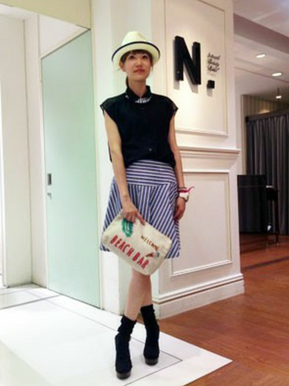 ノースリーブシャツ×フレアスカートの女性らしいスタイルにハットで程よい抜け感をプラス!