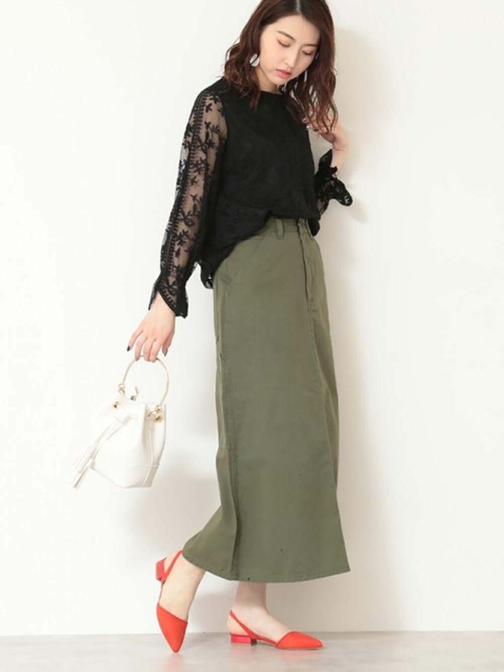 繊細なレース×シアーなデザインで程よい肌見せを実現。カーキカラーのボトムスを合わせたカジュアルライクな着こなしがオススメ。