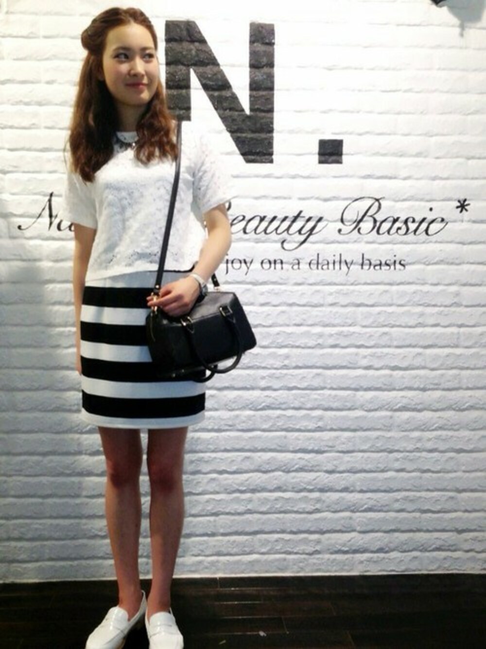 レーストップスとボーダースカートの組み合わせには、足元にローファーをプラスして甘め大人カジュアルに昇華!