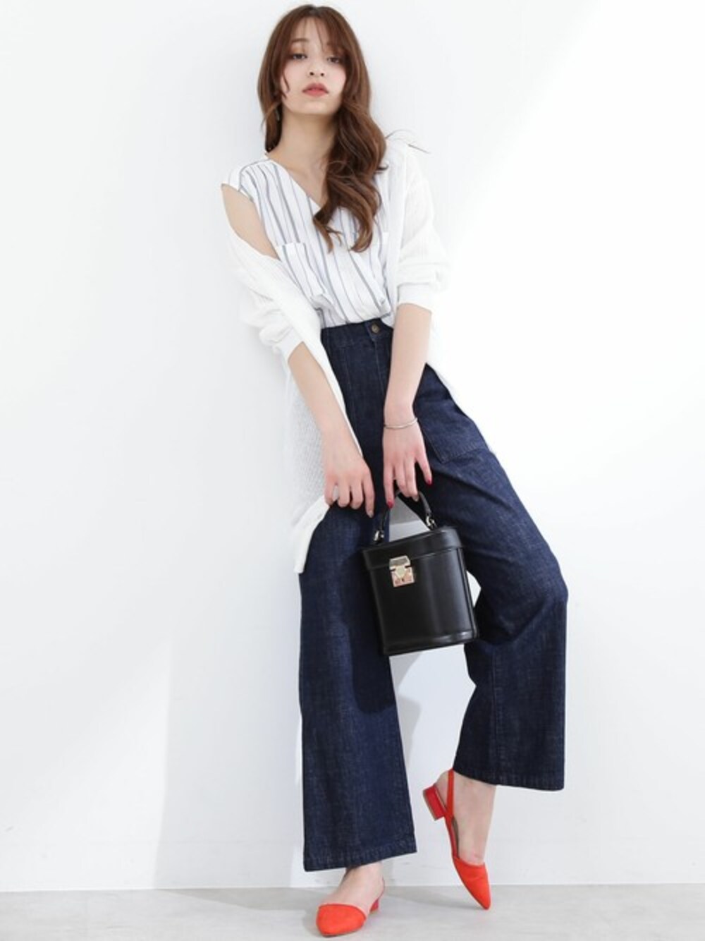 夏の羽織りにぴったりなドライタッチ素材を使用したカーディガン。ミドル丈×ワイドデニムのルーズな合わせには、シャープな印象を与えるストライプ柄のインナーでバランスを。