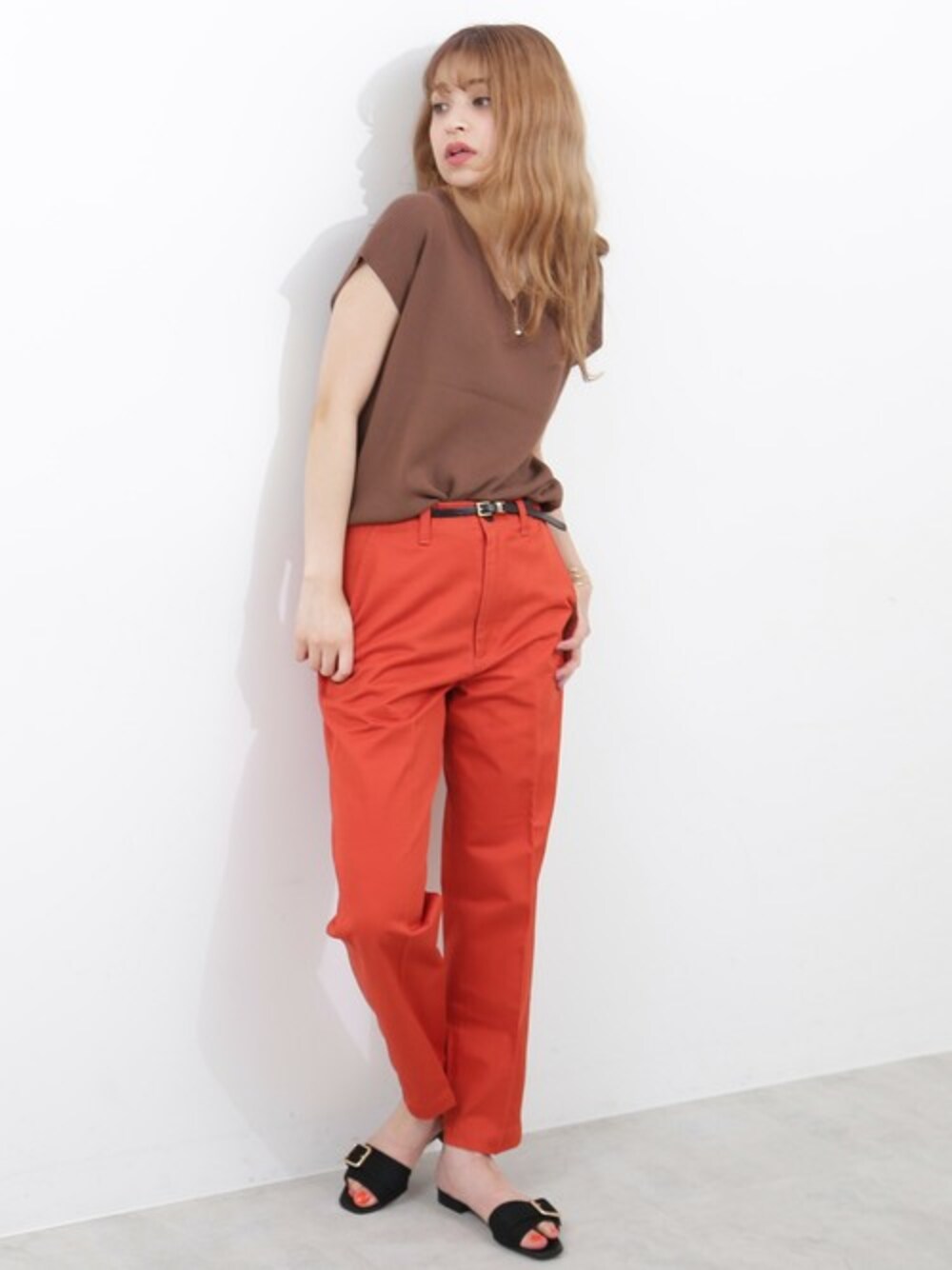 子どもっぽくなりがちなオレンジカラーのパンツには、上品なブラウンカラーのトップスを。