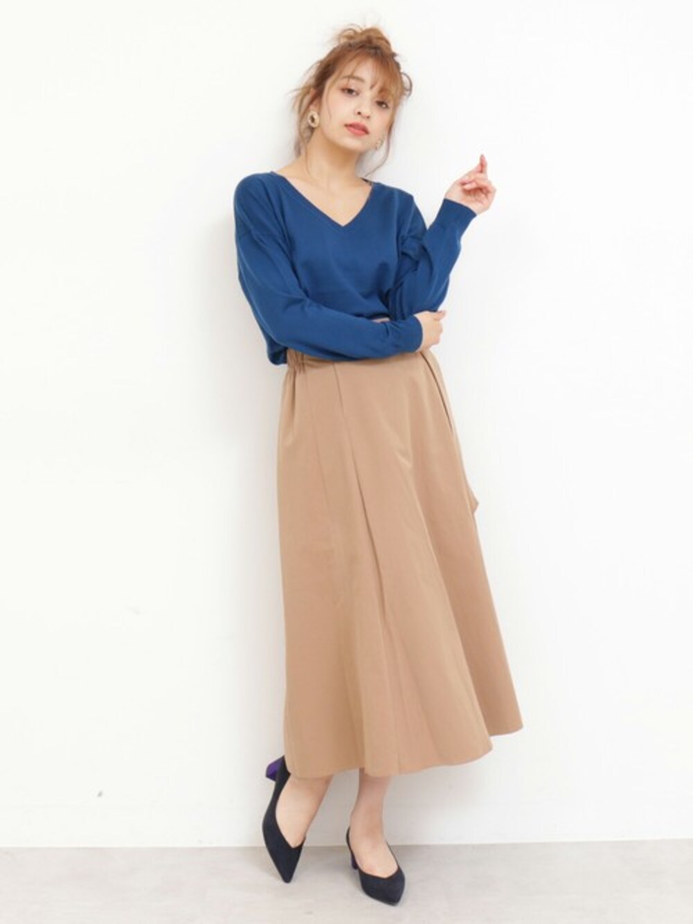 Vネックニット×フレアスカートでとことん女性らしく。この秋は少しだけくすんだカラーがおすすめ。