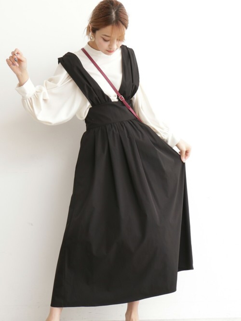女性らしいブラウス×ワンピースは、モノトーンカラーで大人っぽく。