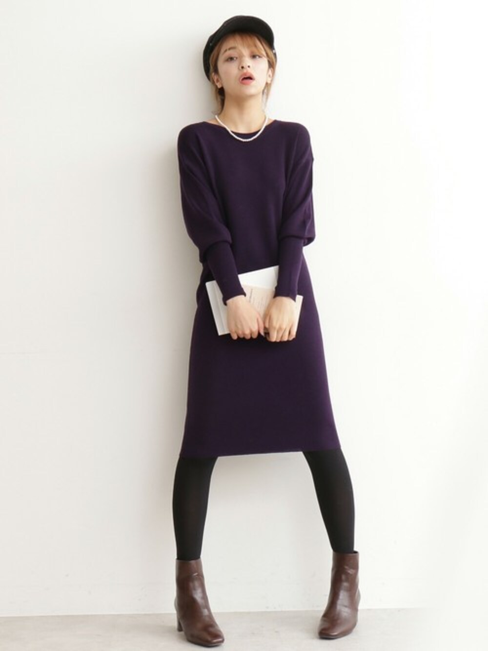 袖ディテールが可愛いニットワンピース。今年は思い切ってトレンドのパープルカラーに挑戦して。