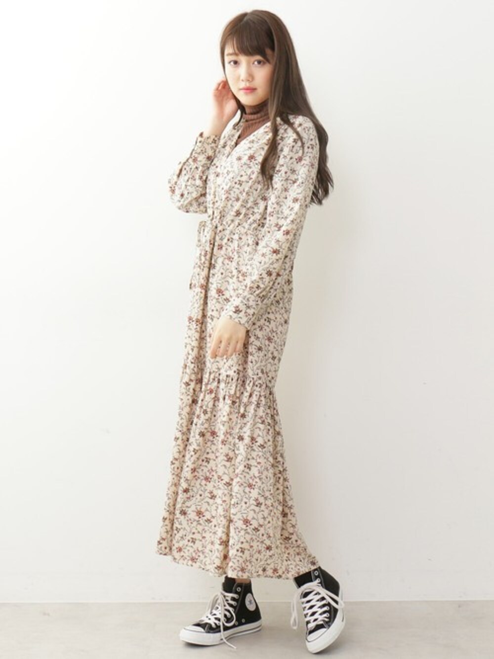 おしゃれの基本は「あえて重ねる」こと。1枚で着ると女性らしいワンピースに、タートルネックを合わせて少しモダンに。