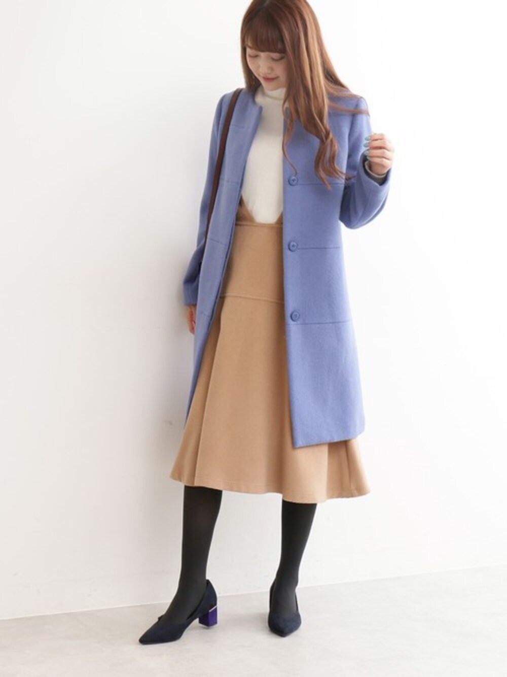 少しくすんだペールブルーのコートは、グレー感覚で着ることができる今季おすすめのカラーアイテムです。