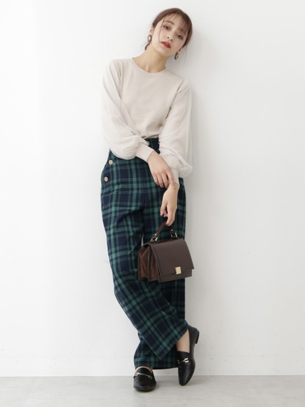 グリーンの差し色が利いた アクセントのあるチェックパンツ。 簡単にスタイルアップさせてくれる ハイウエストのデザインも○