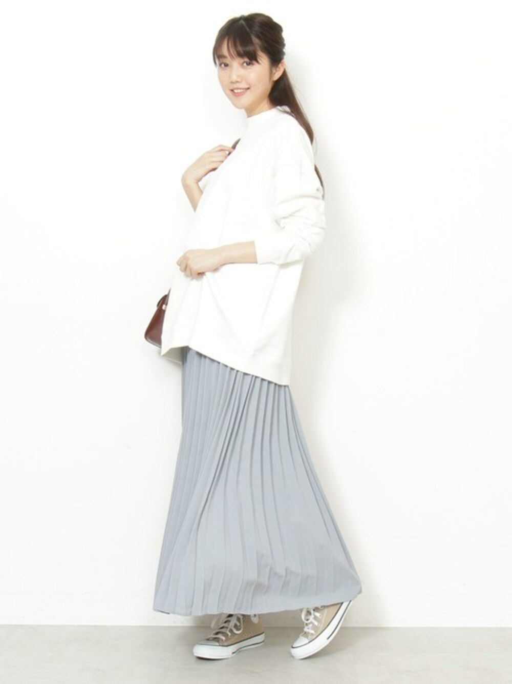 最近のカジュアルトレンドには欠かせない 無地スウェットは、 女性らしくプリーツスカートで 合わせるのがN.流。