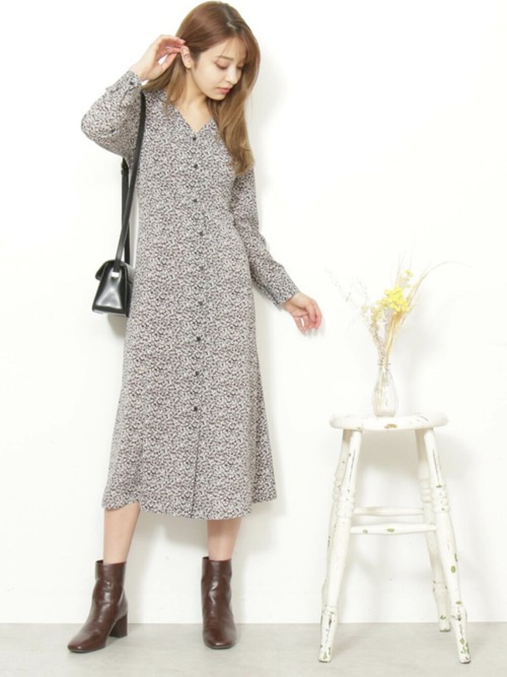 春先にぴったりな小花柄ワンピースが登場。 レザータッチのバッグやショートブーツ合わせて、 ヴィンテージライクな雰囲気に。
