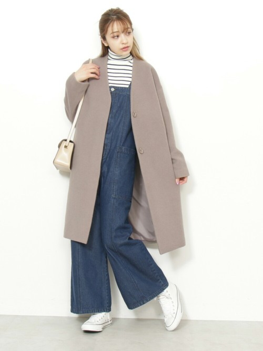 カジュアルスタイルの 定番アイテムとなっている “オーバーオール” ノーカラーコートを羽織れば 少し大人っぽいスタイルに変身。