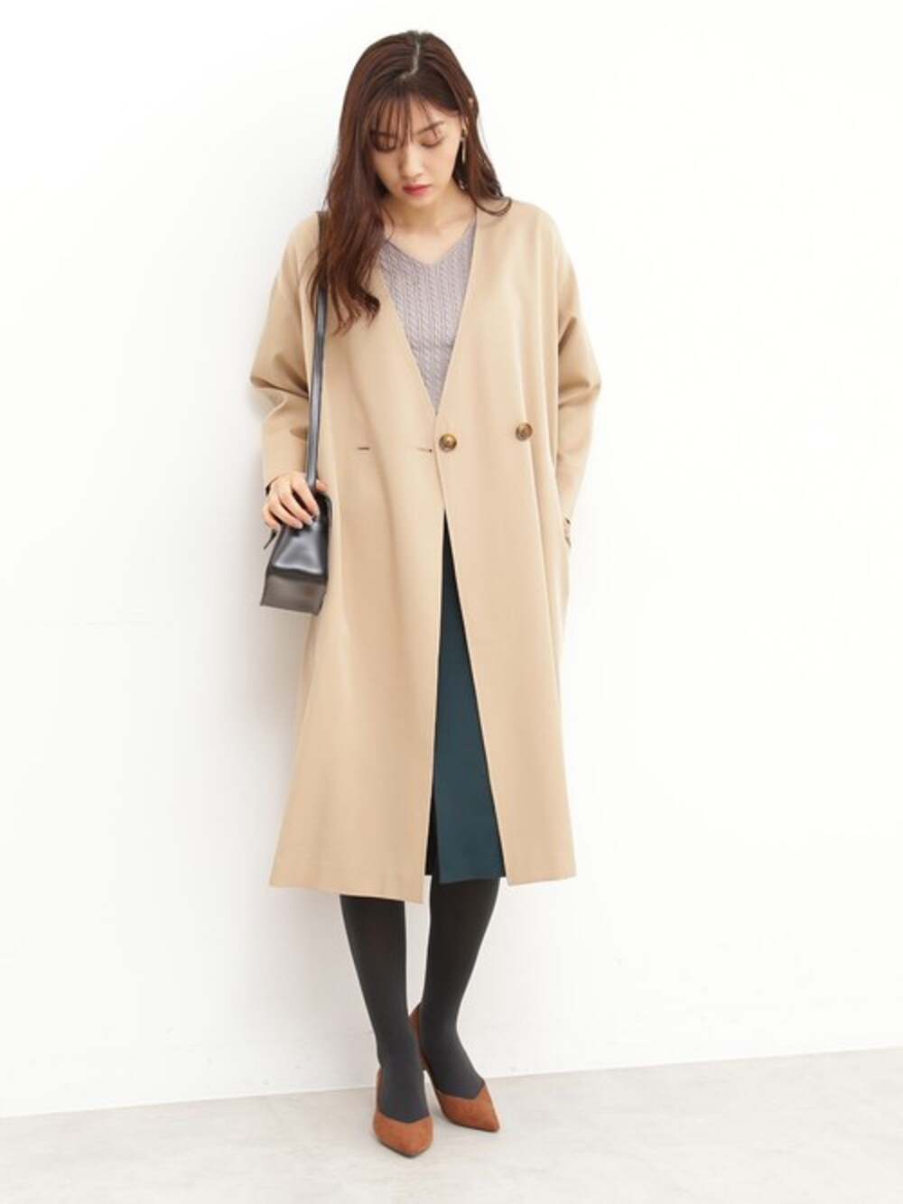 たっぷりとしたシルエットのトレンチコートには、 フィット感のあるニットやタイトスカートを合わせて 中はスッキリと見せるのがルール。