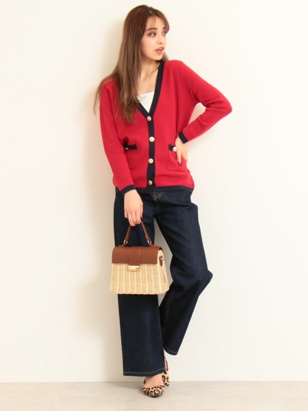 インパクトのあるバイカラーカーディガン。 赤を悪目立ちさせずに引き立ててくれる、 インディゴカラーデニムを合わせて。