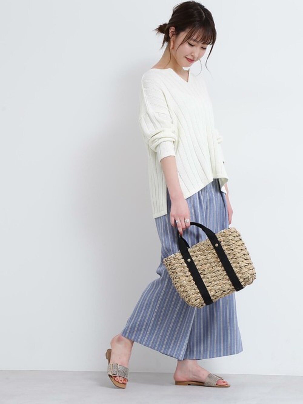 ざっくり編みのニットにワイドパンツを合わせたリラクシースタイルです。