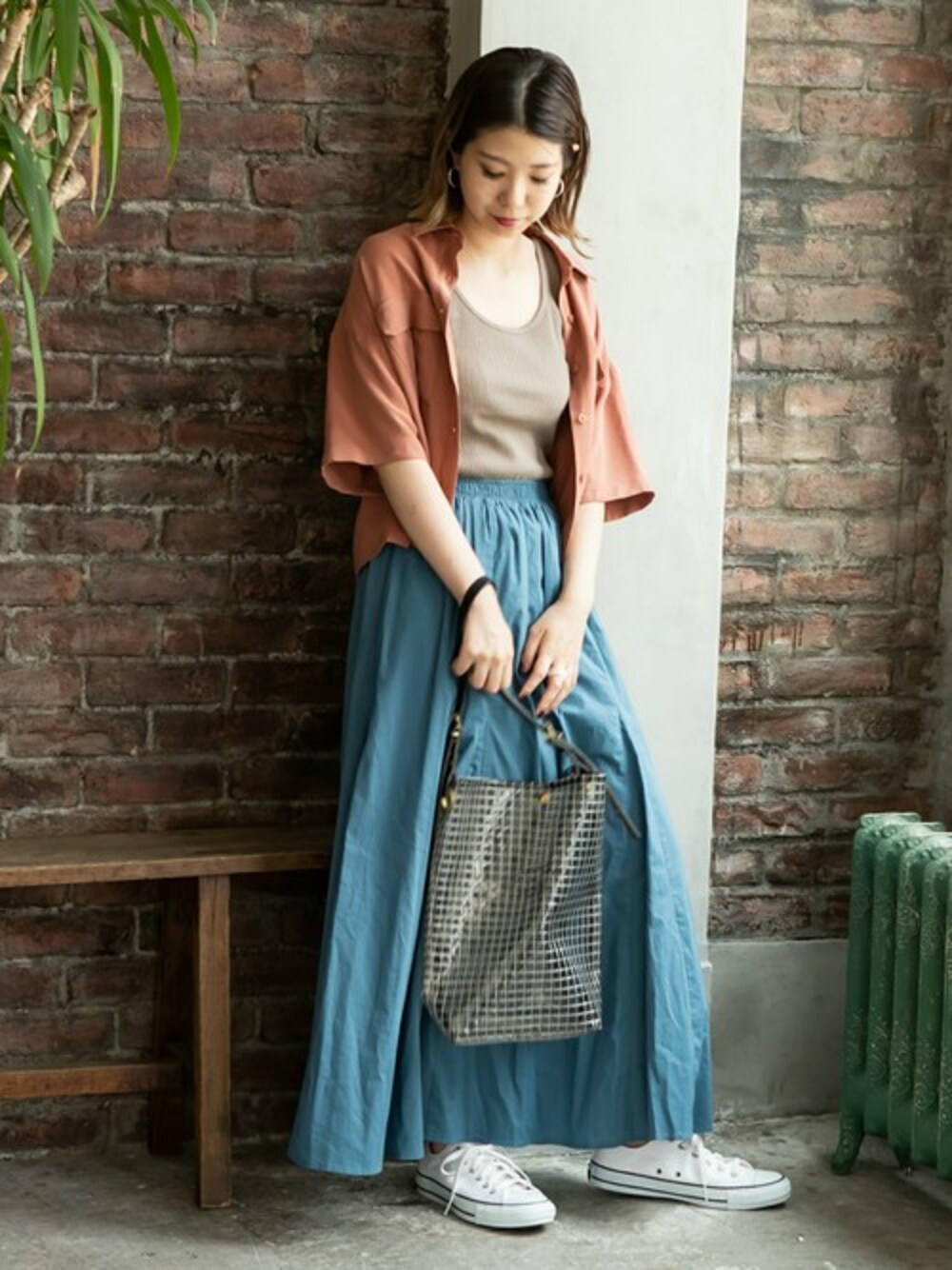 スモーキーなカラーが今の気分。 ショート丈のシャツ×マキシスカートは、 スタイルUPして見えるバランスコーデ。