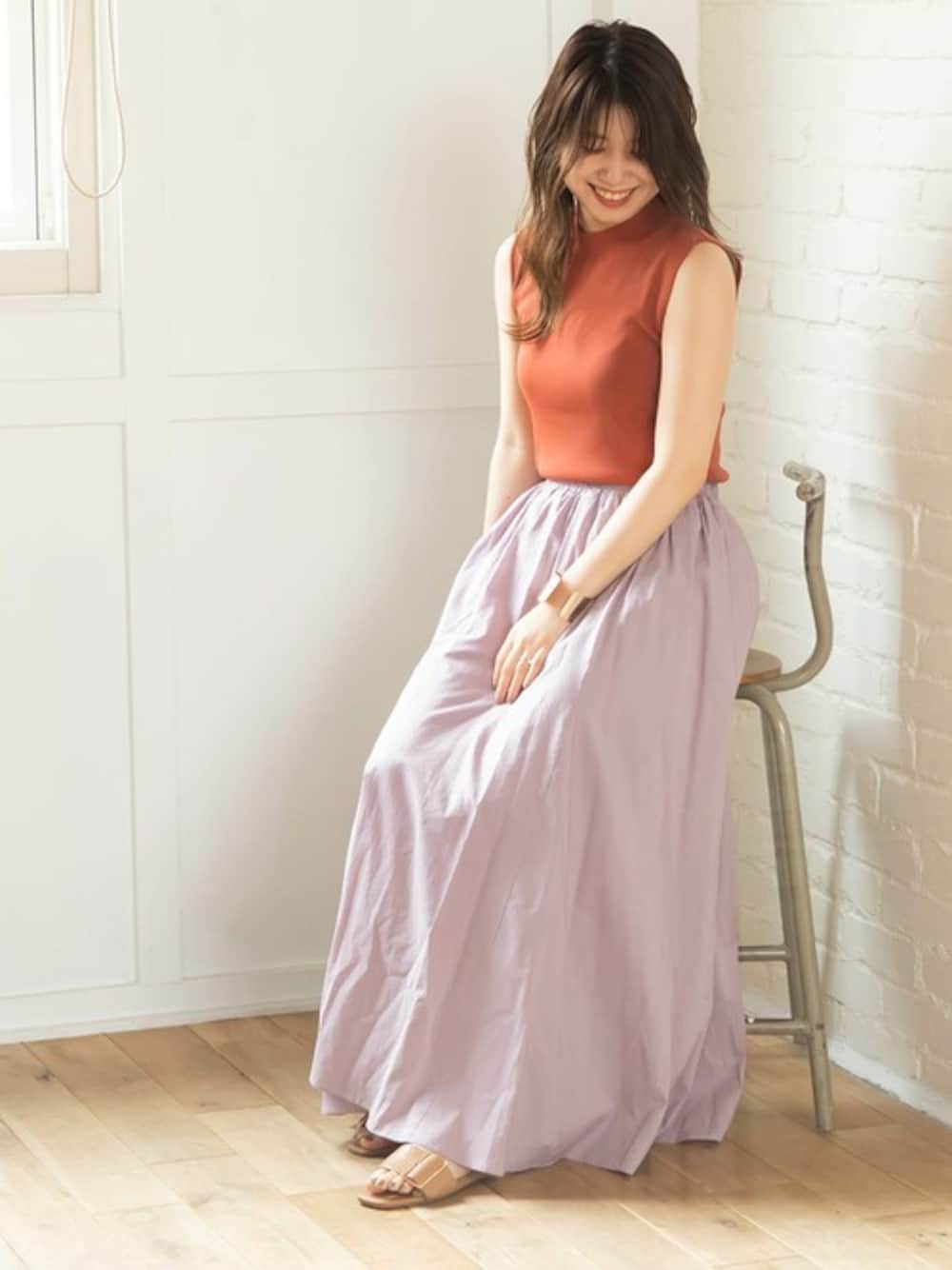 着るだけで映えるテラコッタオレンジが新色で登場! ほんのり染めたピンクカラーのスカートと相性バツグンです。