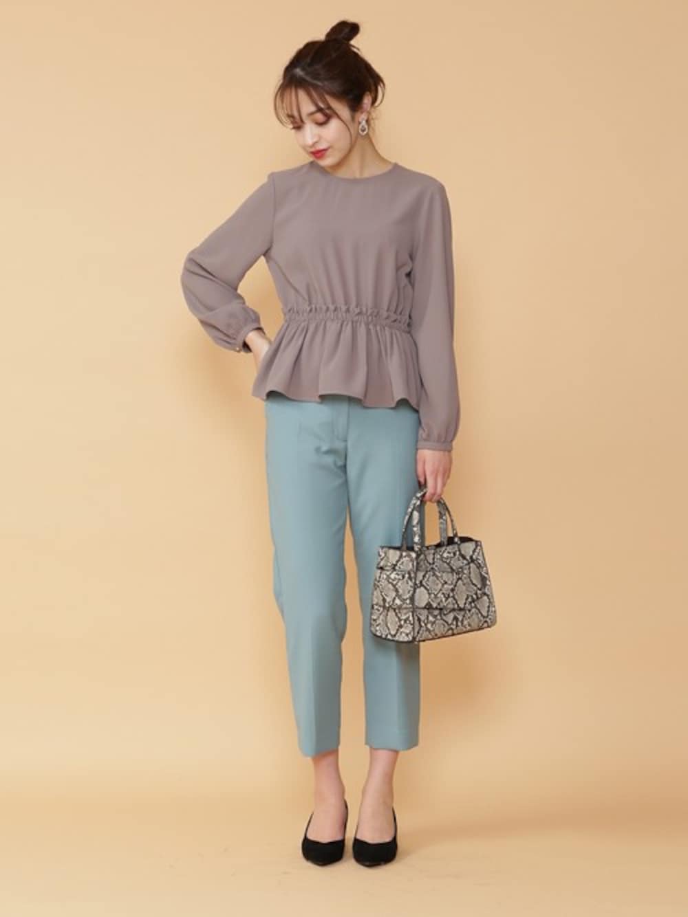 ウエストラインを絞ったペプラムブラウスに、 ストレートパンツを合わせて一気にスタイルUP。 全体的にニュアンスカラーでまとめつつ、 足元は黒のパンプスで引き締めてメリハリを。