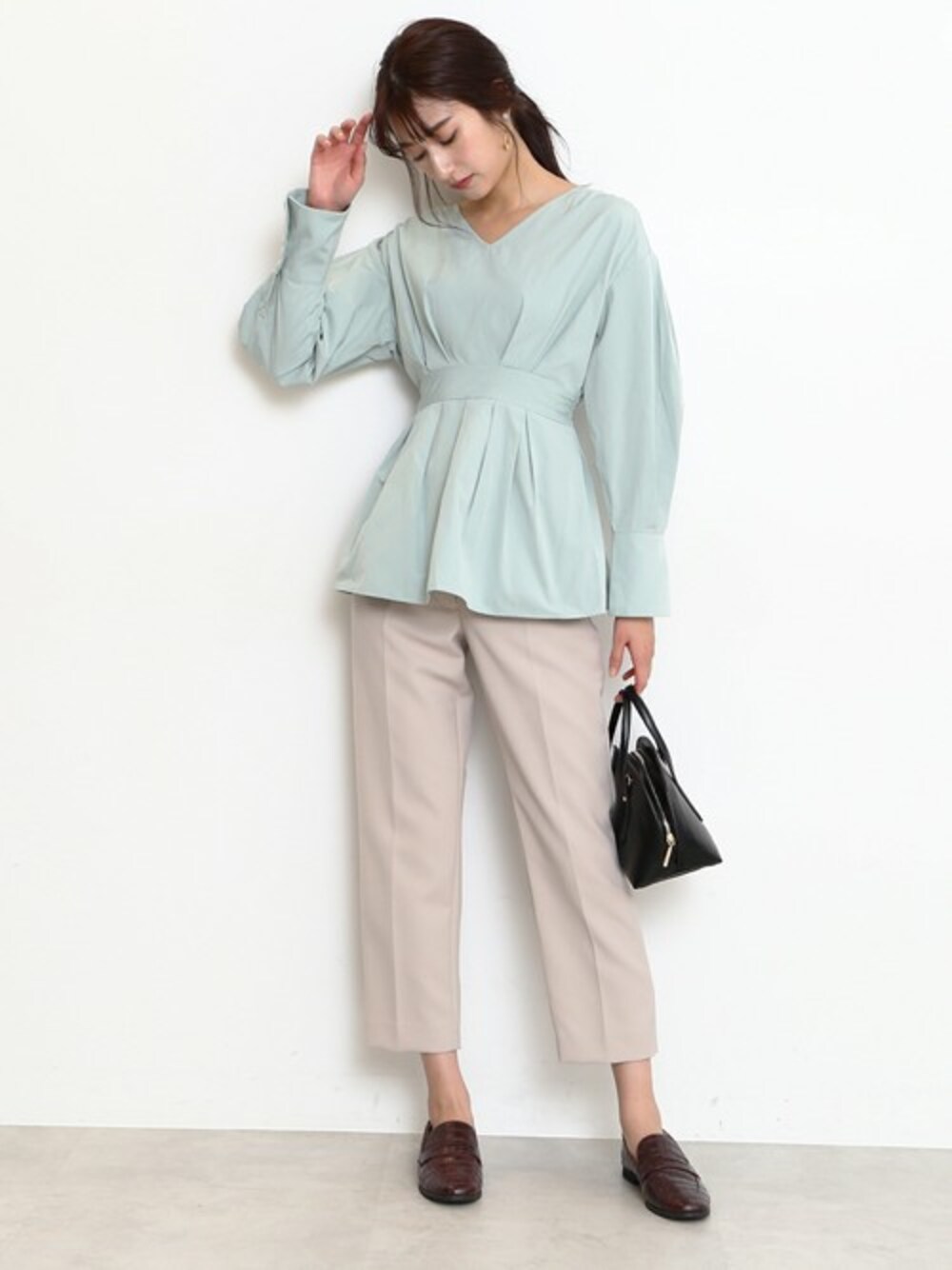 春らしいカラーが目を惹くペプラムブラウス。 ウエストラインを見せたデザインは、 ワイドなパンツと合わせてもスッキリ見えします。 コーディネートを引き締める小物使いもポイント。