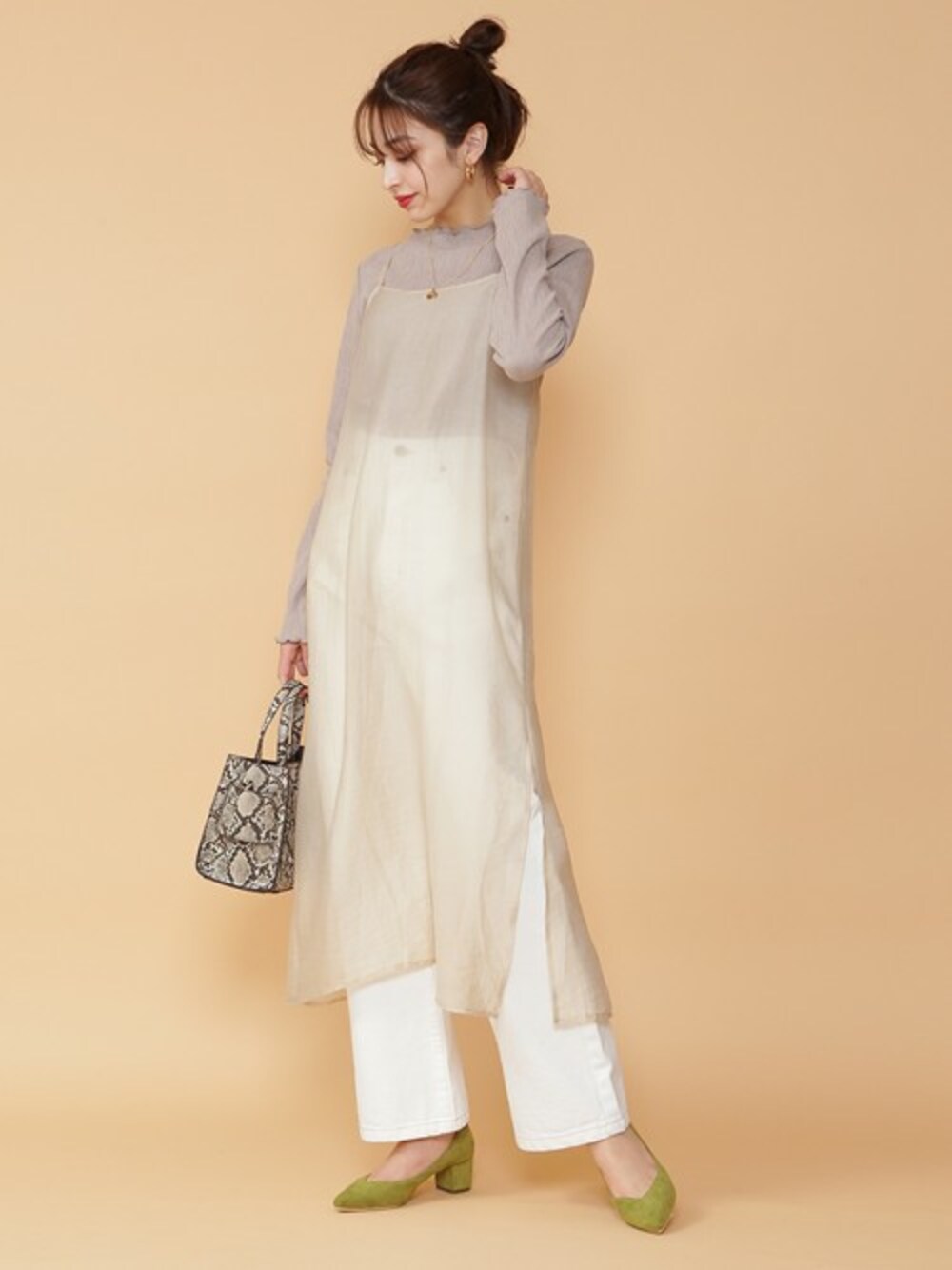 透け感のあるワンピースを重ねた着こなしと、 ホワイトデニムを合わせて一気に春らしいスタイリングに。 バッグで取り入れた“パイソン柄”は、 この春も引き続き注目を集めています。
