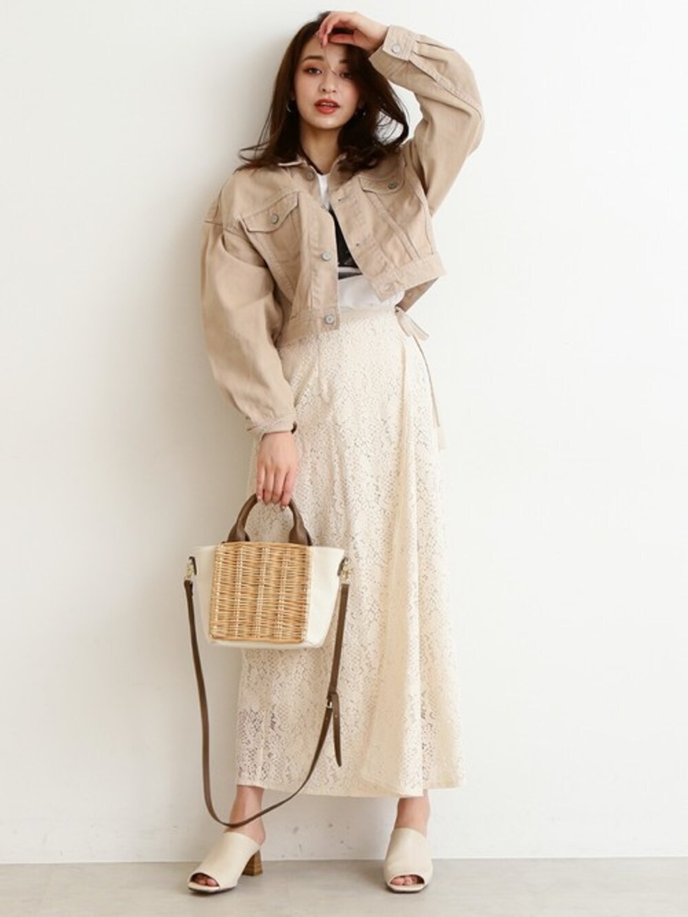 ホワイトとベージュを基調とした春コーデ。 レース素材のスカートが女性らしい甘さを演出しつつ、 デニムジャケットで程よい辛さもMIXして。