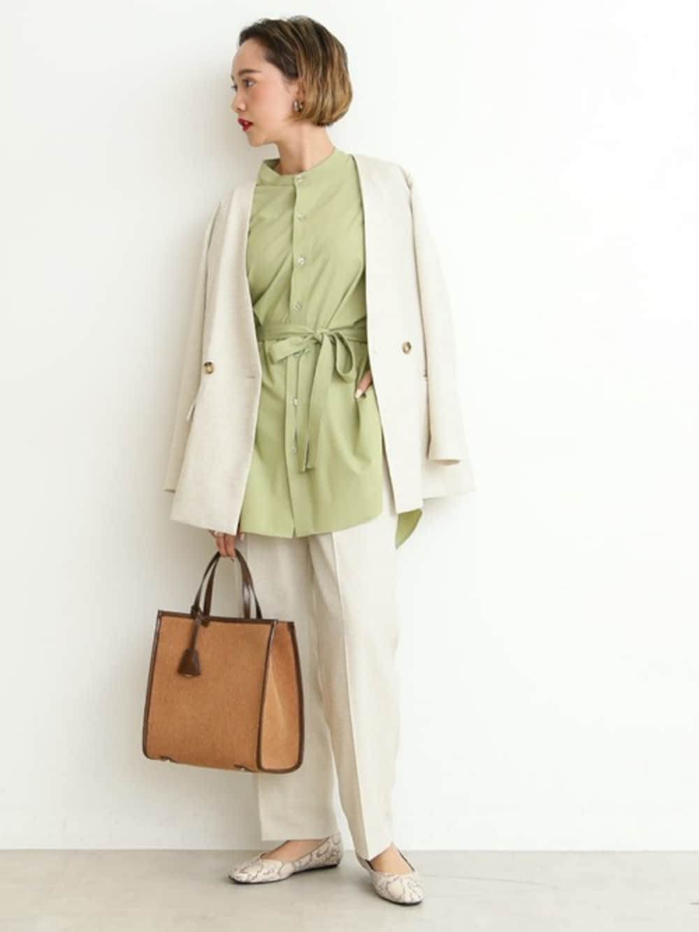 今季注目されているジャケットスタイルは、 セットアップで揃えてよりおしゃれに。 インナーにはダスティグリーンのシャツブラウスを効かせて、 鮮度のあるコーディネートを。