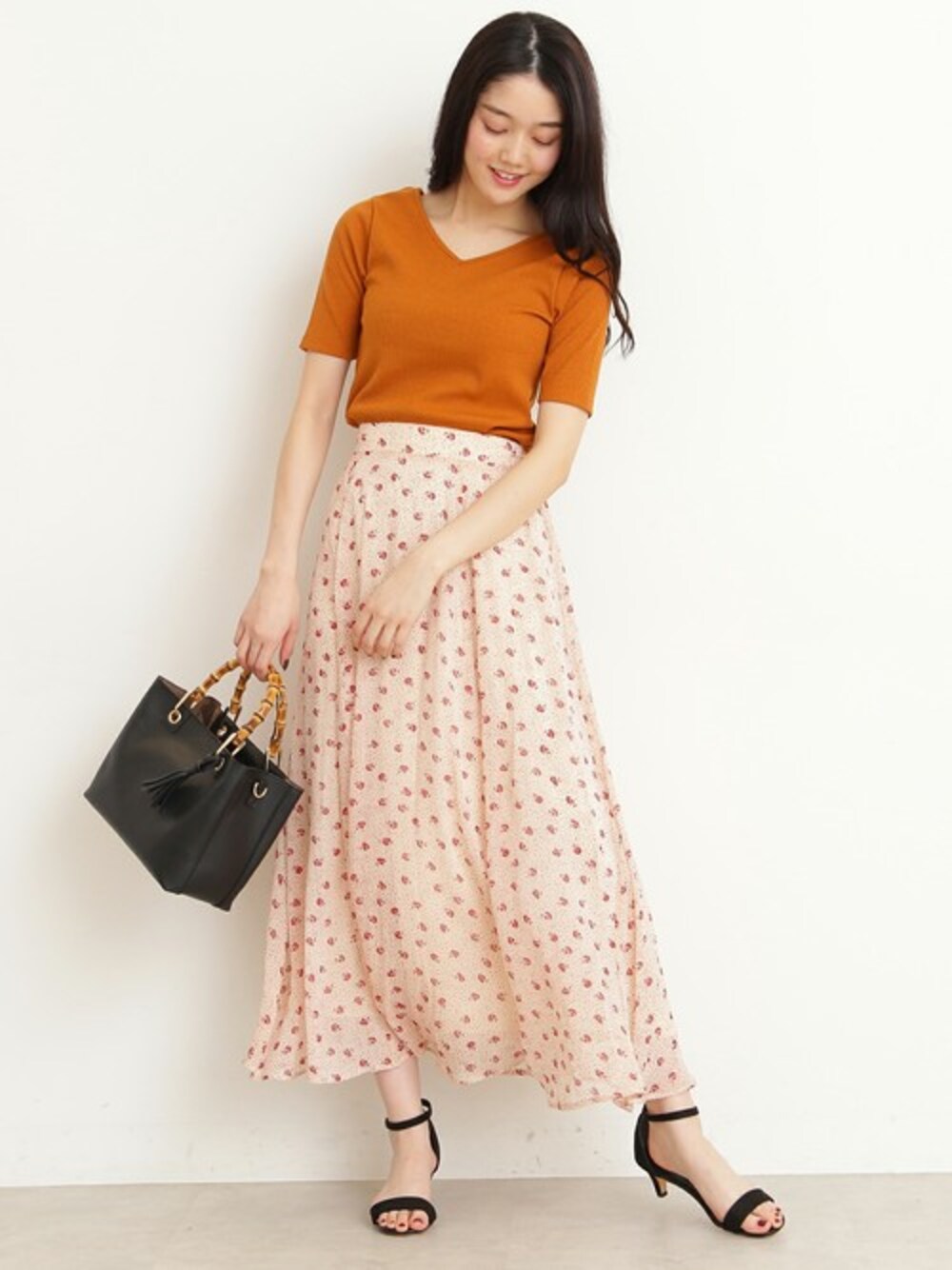 花柄スカートを今年らしく着こなすなら、カットソーと合わせて少しだけ“ラフ”に。足元は華奢なサンダルで女性らしさも意識して。