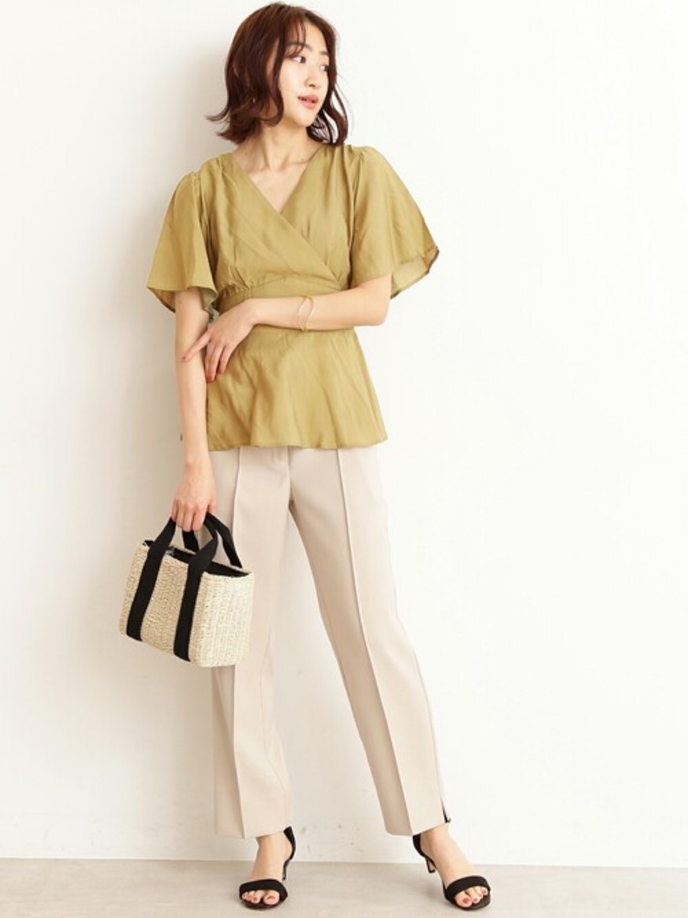 ほんのり色づいたカーキのブラウスを主役に、ボトムスや小物は落ち着いたカラーでまとめて。1枚で華やかなペプラムブラウスは、シンプルなパンツスタイルがおすすめ。