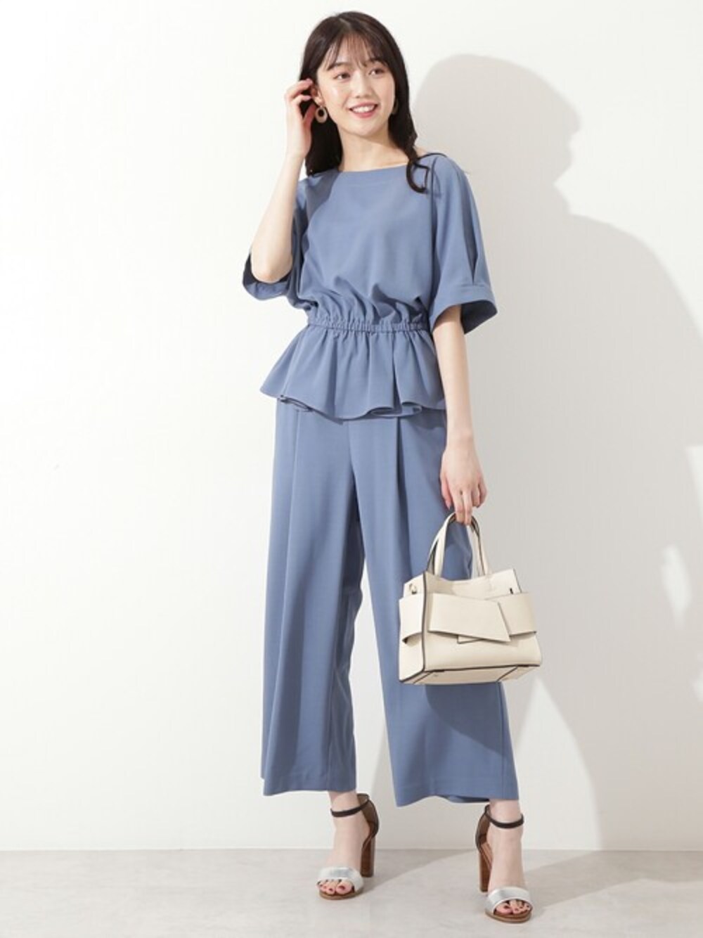 夏にぴったりなセットアップアイテムが登場!スタイルUPしてくれるペプラムデザインと、タックが入ったリラクシーなワイドパンツがポイントです。