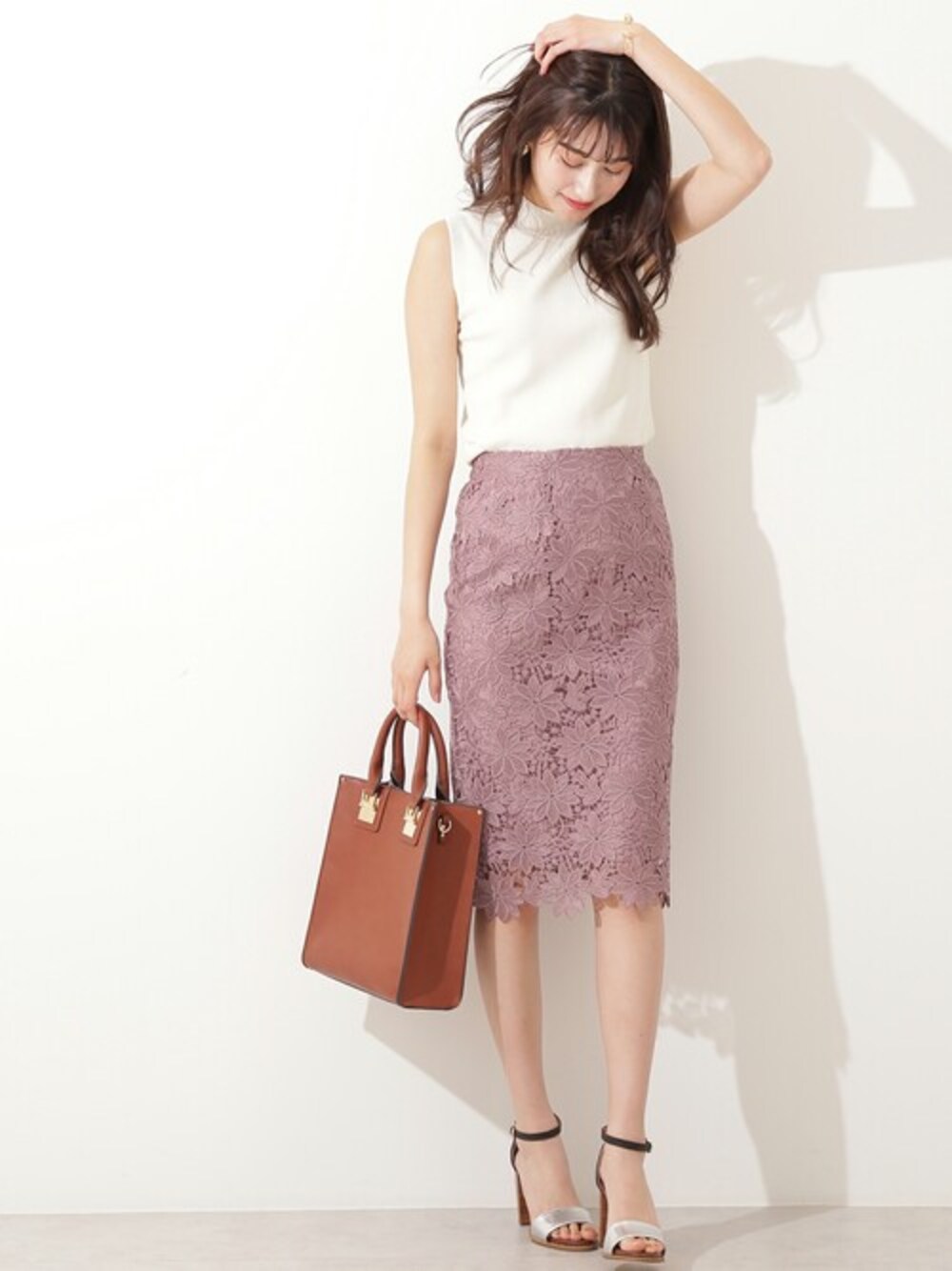 1枚で華やかなケミカルレースタイトスカートは、シンプルな着こなしで上品に。シルバーのサンダルがアクセントになり、夏らしさをより一層引き立てます。