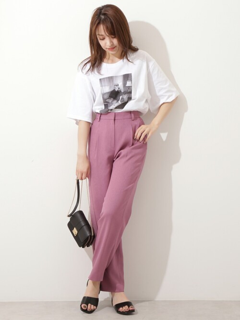 シャリ感のあるカラーパンツは、夏まで涼しく着られるおすすめアイテムです。大人っぽい新作のフォトTと合わせて、都会的なカジュアルスタイルの完成です。