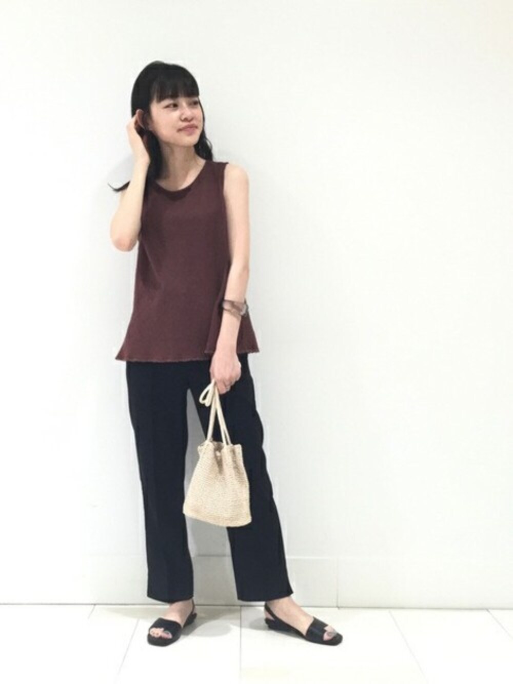 上下をダークトーンで合わせた中に、夏らしい麻素材を取り入れて大人のリラックススタイルに。ラインの綺麗なピンタックパンツはオンオフ着回し⌾