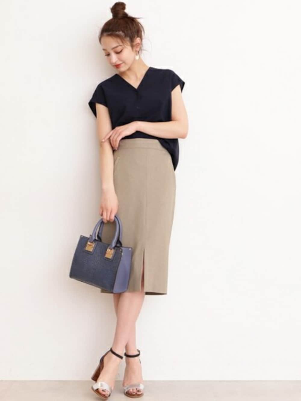 清涼感のあるドライタッチのブラウスは、夏の通勤スタイルには欠かせないアイテム。ワンポイントのスタッズが施されたタイトスカートを合わせて、少しだけ個性もプラスして。