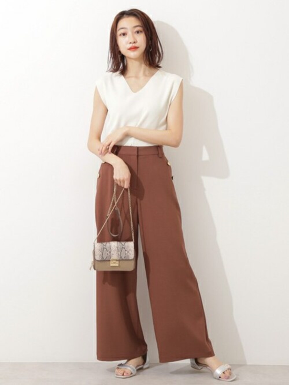 首元をスッキリと見せるVネックニットには、ワイドパンツが相性バツグンです。カジュアルな雰囲気の中に、ブラウンカラーやパイソンの小物使いで少し大人っぽく。