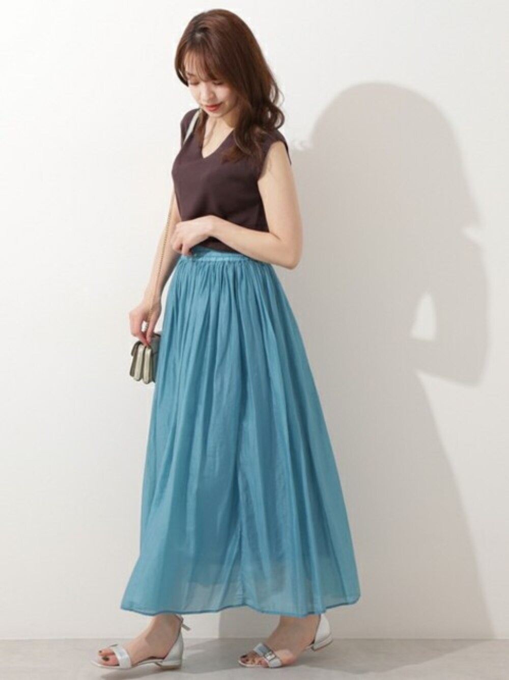 さらっとした着心地がクセになる総針ニットに、鮮やかなギャザースカートを合わせてレディな印象に。足元はスニーカーでカジュアルにまとめても可愛いです。